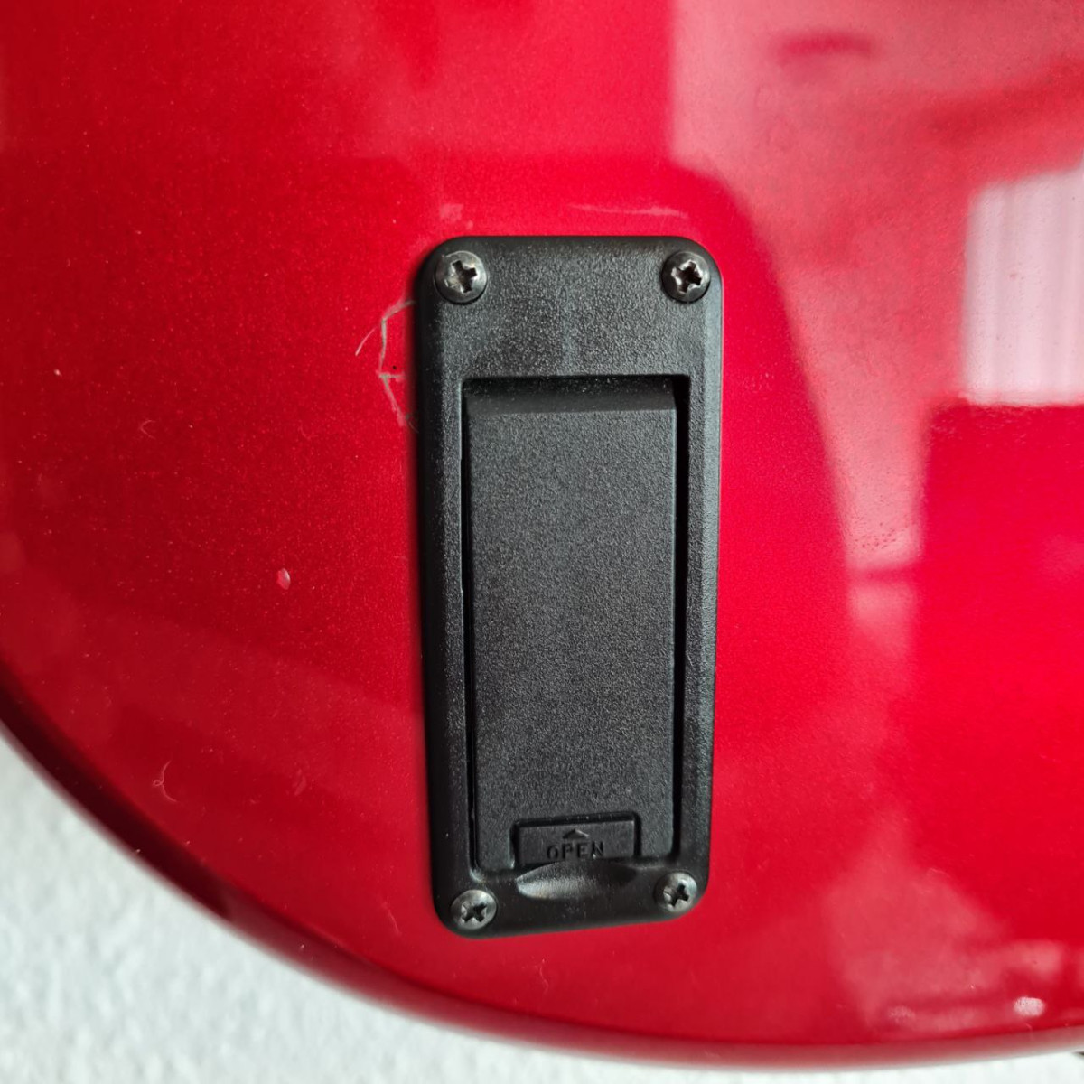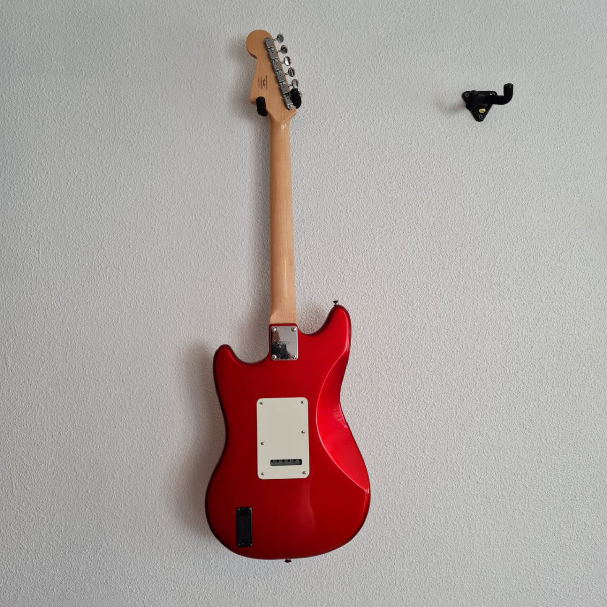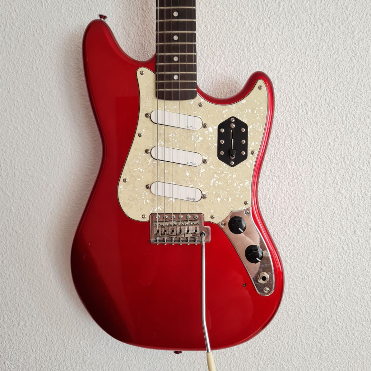 Esta es una rara Squier Paranormal Cyclone Candy Apple Red con pastillas activas EMG, que en su día pedí al luthier que instalara. La guitarra está en excelente estado, funciona perfectamente y suena genial. Lamentablemente, tiene dos pequeños desconchones en la pintura: uno en la parte frontal y otro en la parte trasera del cuerpo. Por eso he puesto un precio muy bajo. Esta guitarra vale mucho más.
