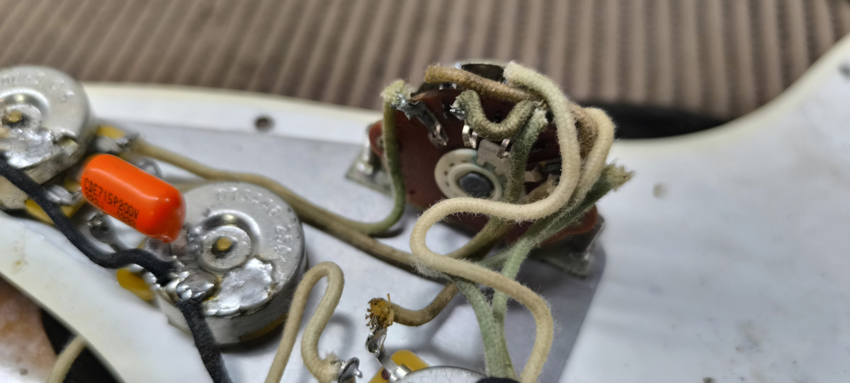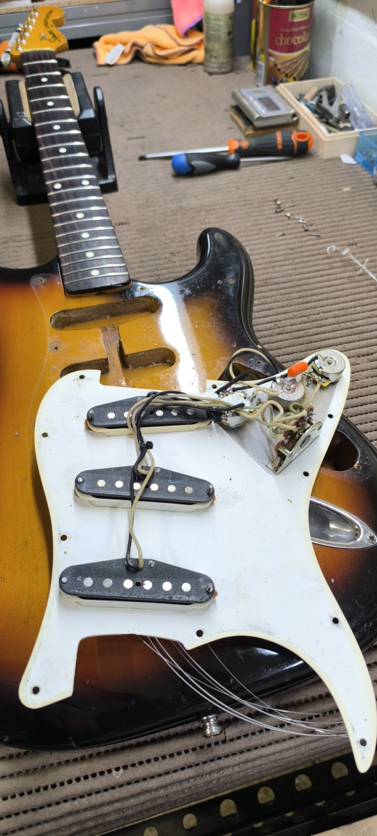 3 color sunburst, mástil de arce y palorrosa (SLAB BOARD!), pastillas originales Fender Fullerton USA Black Bottom. Consideradas las mejores pastillas después de las Pre CBS. Potes cambiados por CTS, recableada y recien retrasteada personalmente por David Rossi.(7,25 vintage como originales) Cejuela de hueso, condensador orange drop, enceradas las 3 pastillas para evitar ruidos y acoples indeseados, nuevo jack enrtrada...en fin.. Para sonar full 50 años más