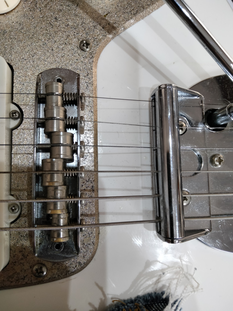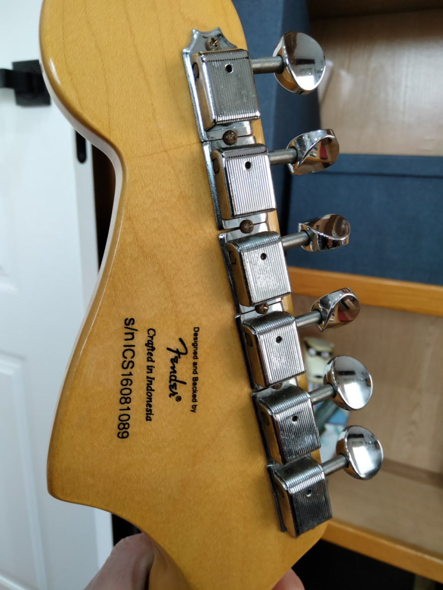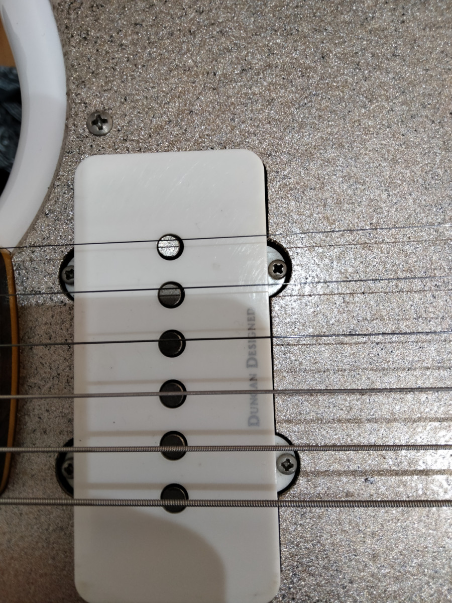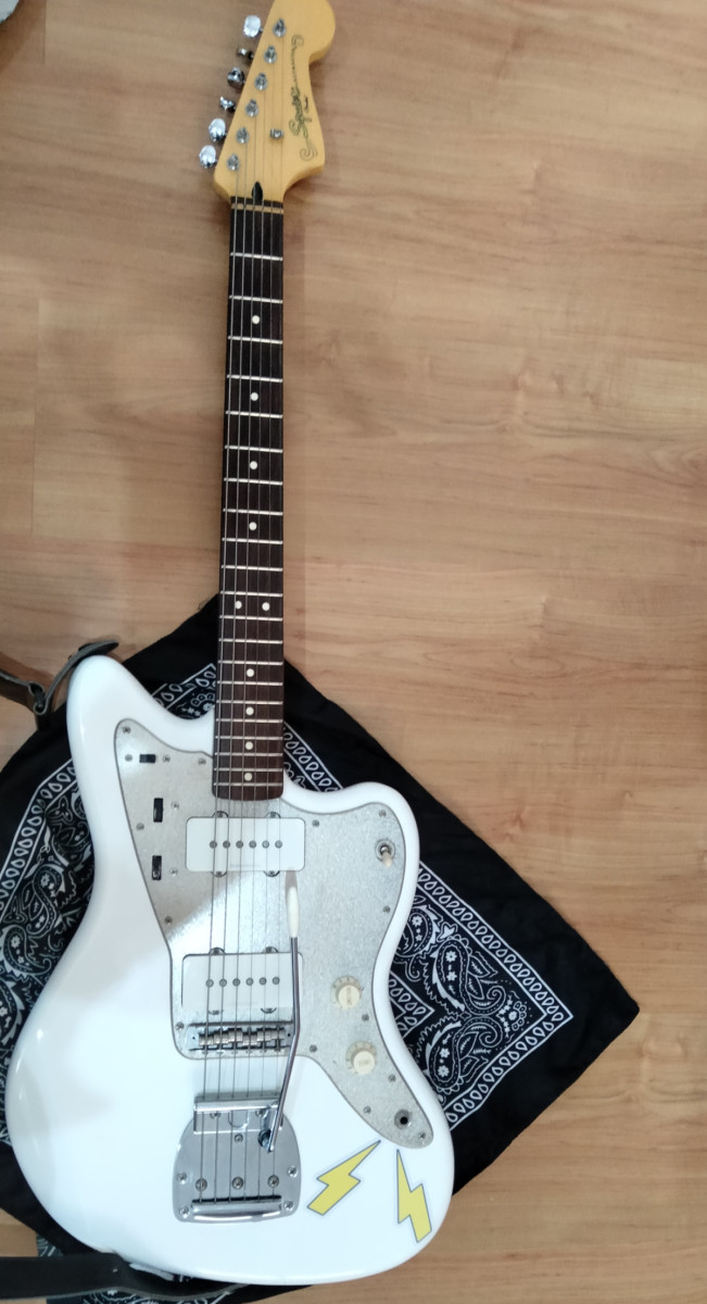En Artic white. Vendo por exceso de material. Mejor que nueva, ajustada por luthier muy recientemente. Original entera, excepto: el puente de Mustang + el Buzz Stop, para que no salte la cuerda entre ranuras y reducir el zumbido de la cuerda en el puente (upgrade típico). Interior apantallado para evitar ruidos o interferencias. Golpeador Golden glitter pintado a mano. Comodidad, trastes enteros, electrónica genial. Cero trasteos. Palanca de trémolo incluida. Sonidazo con las pastillas Duncan Designed de serie. Guitarra bestial en calidad - precio.