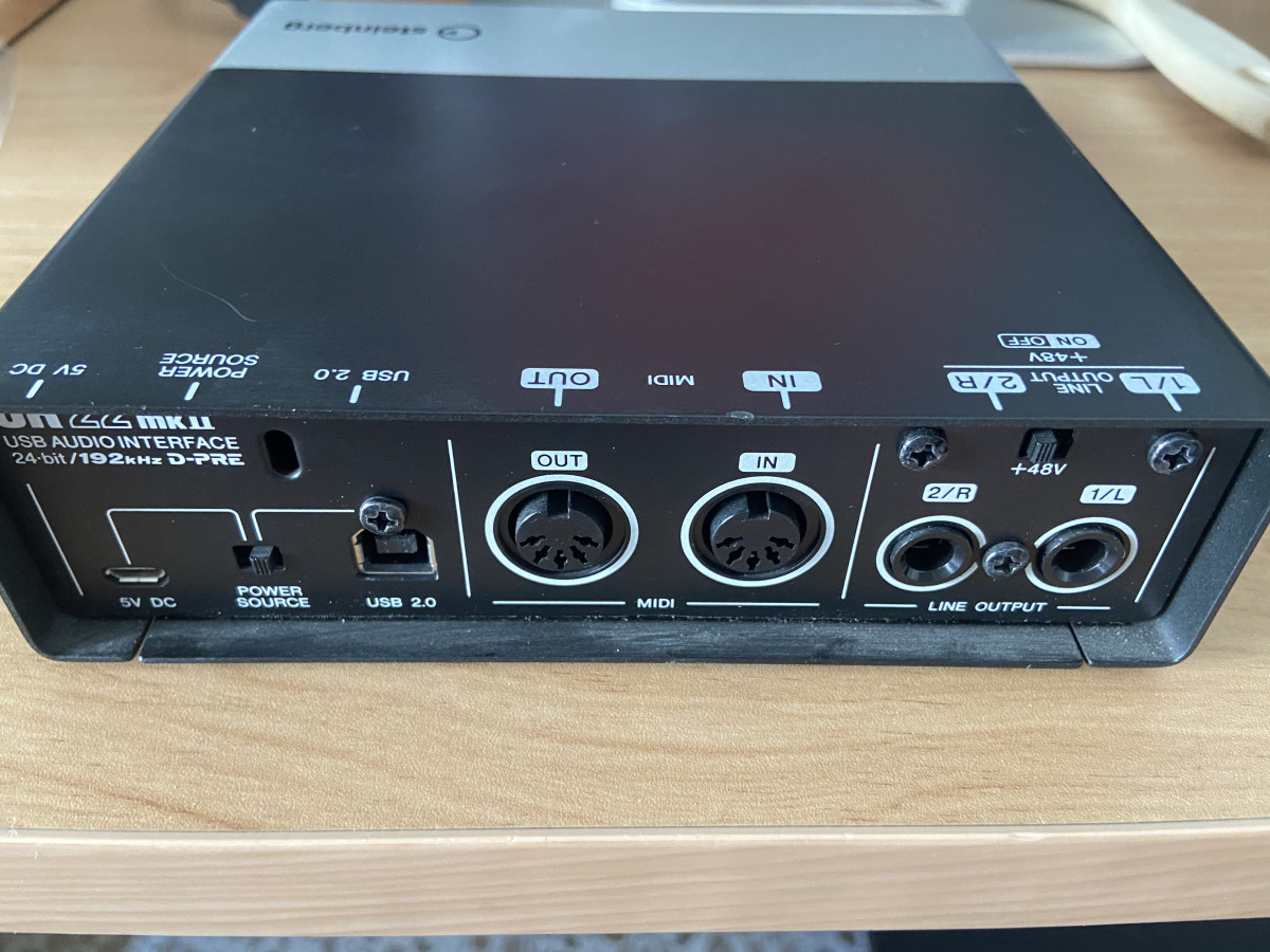 Interfaz de audio impoluta: alimentación por USB (cable incluido) o fuente alimentación (no incluida), dos entradas de micro y dos de línea, entrada y salida midi, alimentación phantom 48v. Incluyo caja original y software Cubase AI y Cubasis LE (licencia no usada nunca).