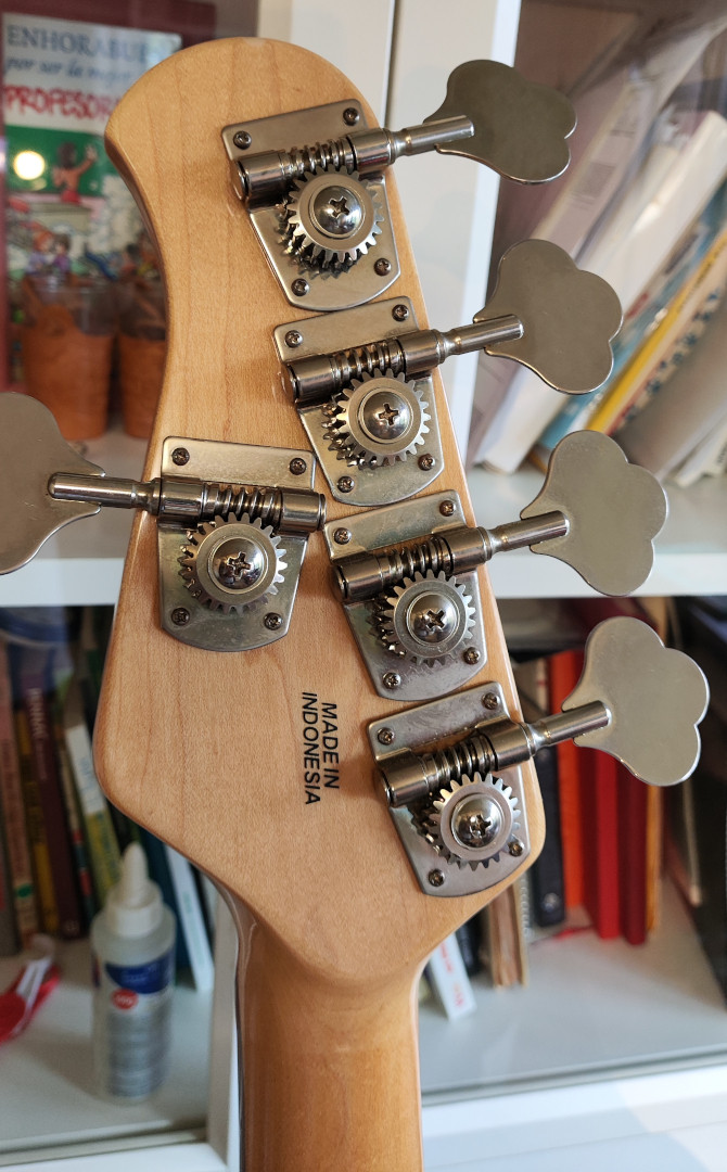 Creo que el cuerpo es de fresno de dos piezas. El bajo va con funda genérica y un juego de cuerdas nuevas, que necesita un cambio ya.