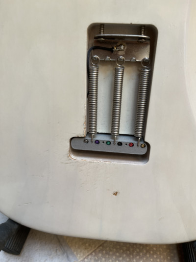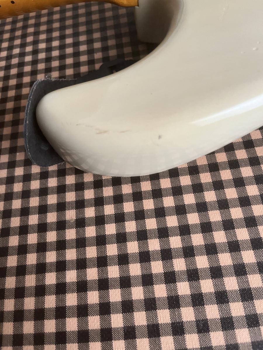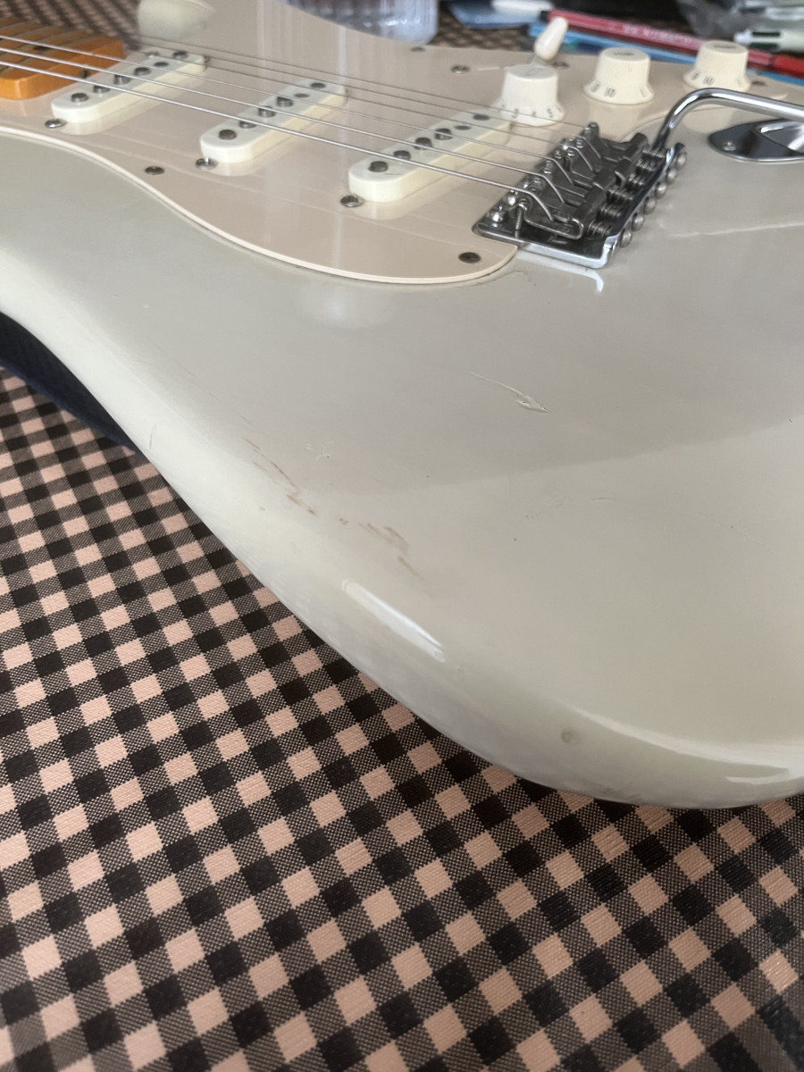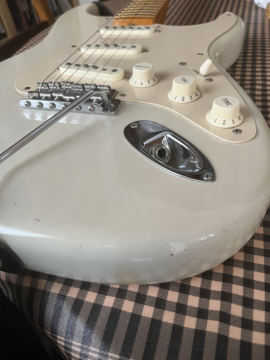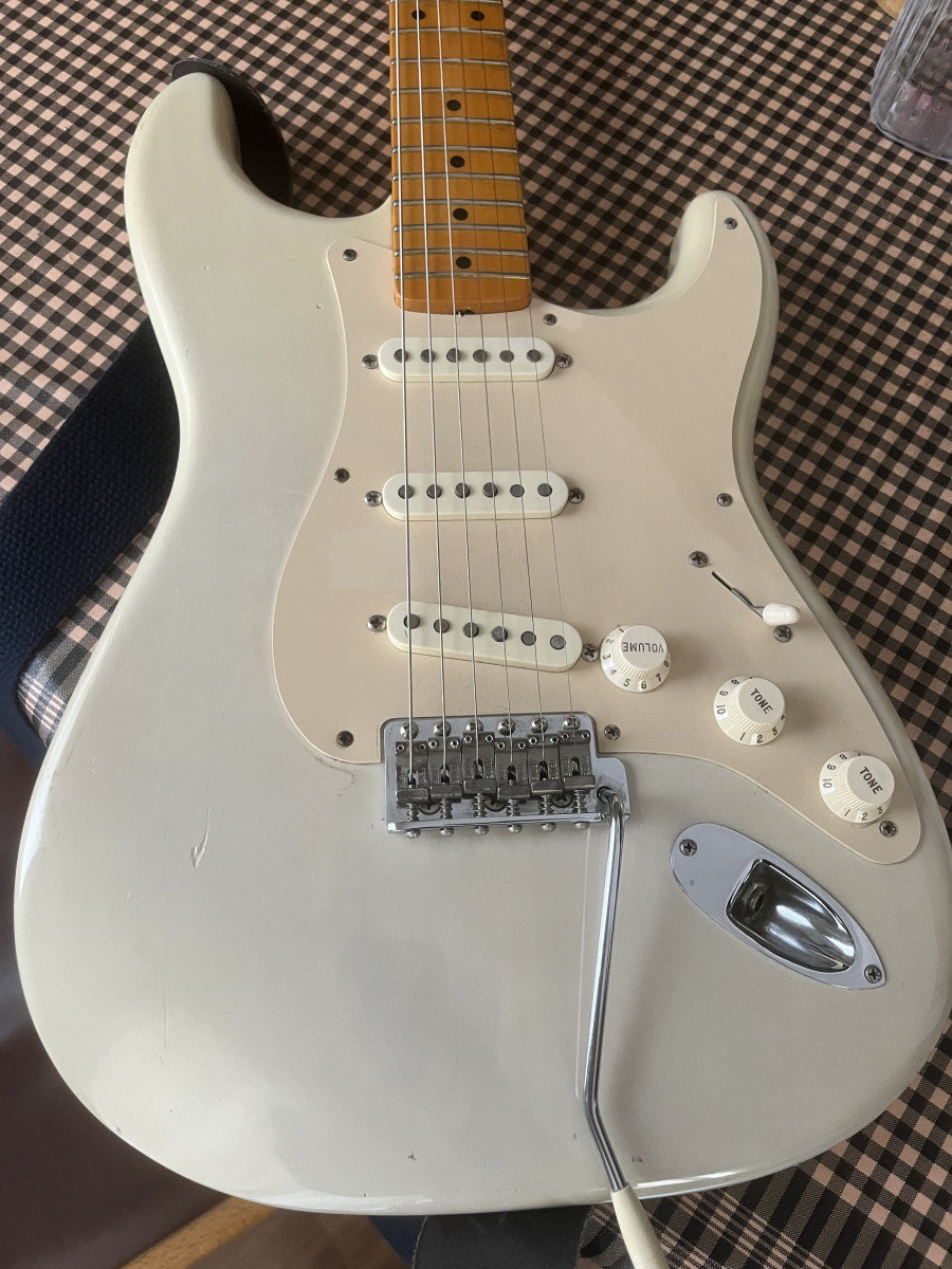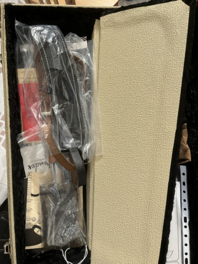 Guitarra ligera y muy resonante, cuerpo de 2 piezas de aliso ligero con contornos tipo 57. acabado white blonde en nitro con algunas marcas de uso, como es de esperar en la nitro. toda original, mástil quartersawn con radio 12, de soft V a C y trastes medium jumbo. puente con receso de cuerdas en el bloque tipo 57(mas masa en el bloque) cejuela de hueso y pastillas EJ originales.