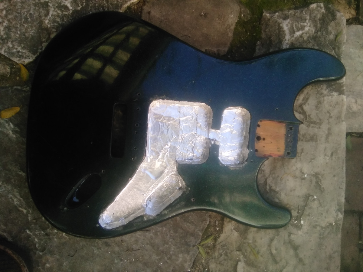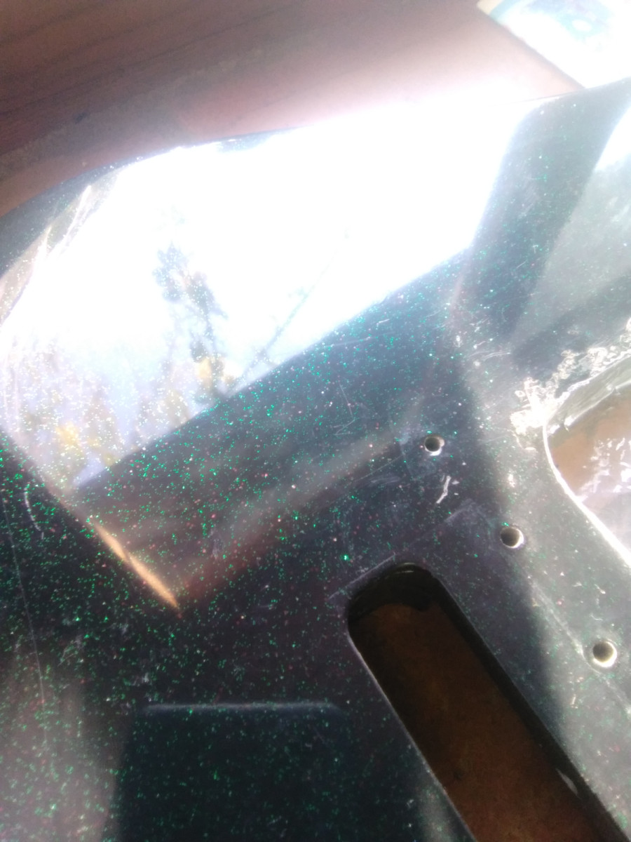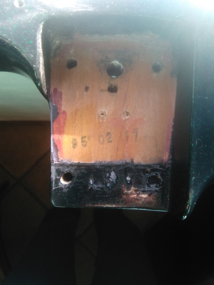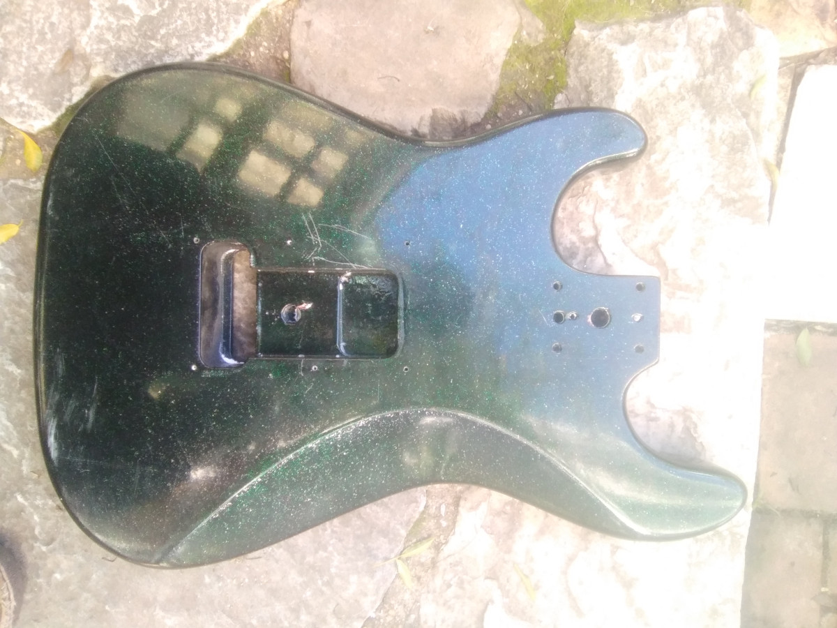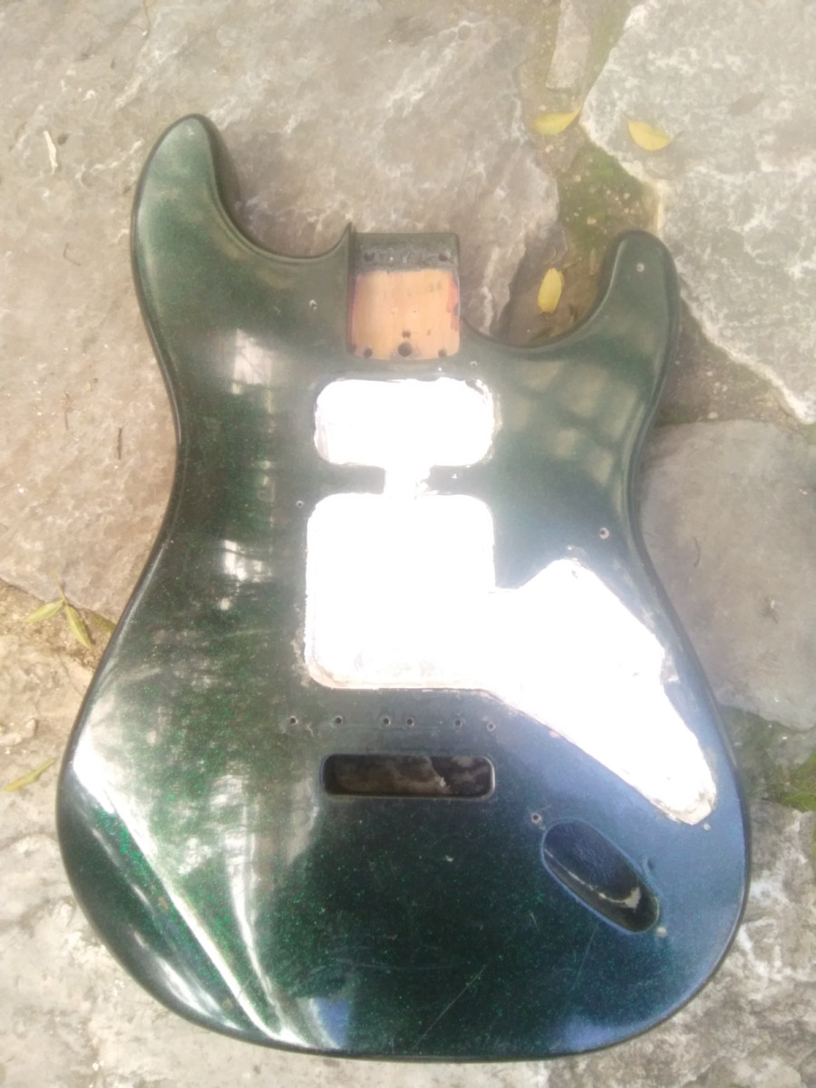 Cuerpo Stratocaster en madera maciza, no sabría decir que madera, posible Aliso, tampoco procedencia de la guitarra. Lo compré hace ya bastantes años como procedencia Japonesa, desde luego medidas Fender.