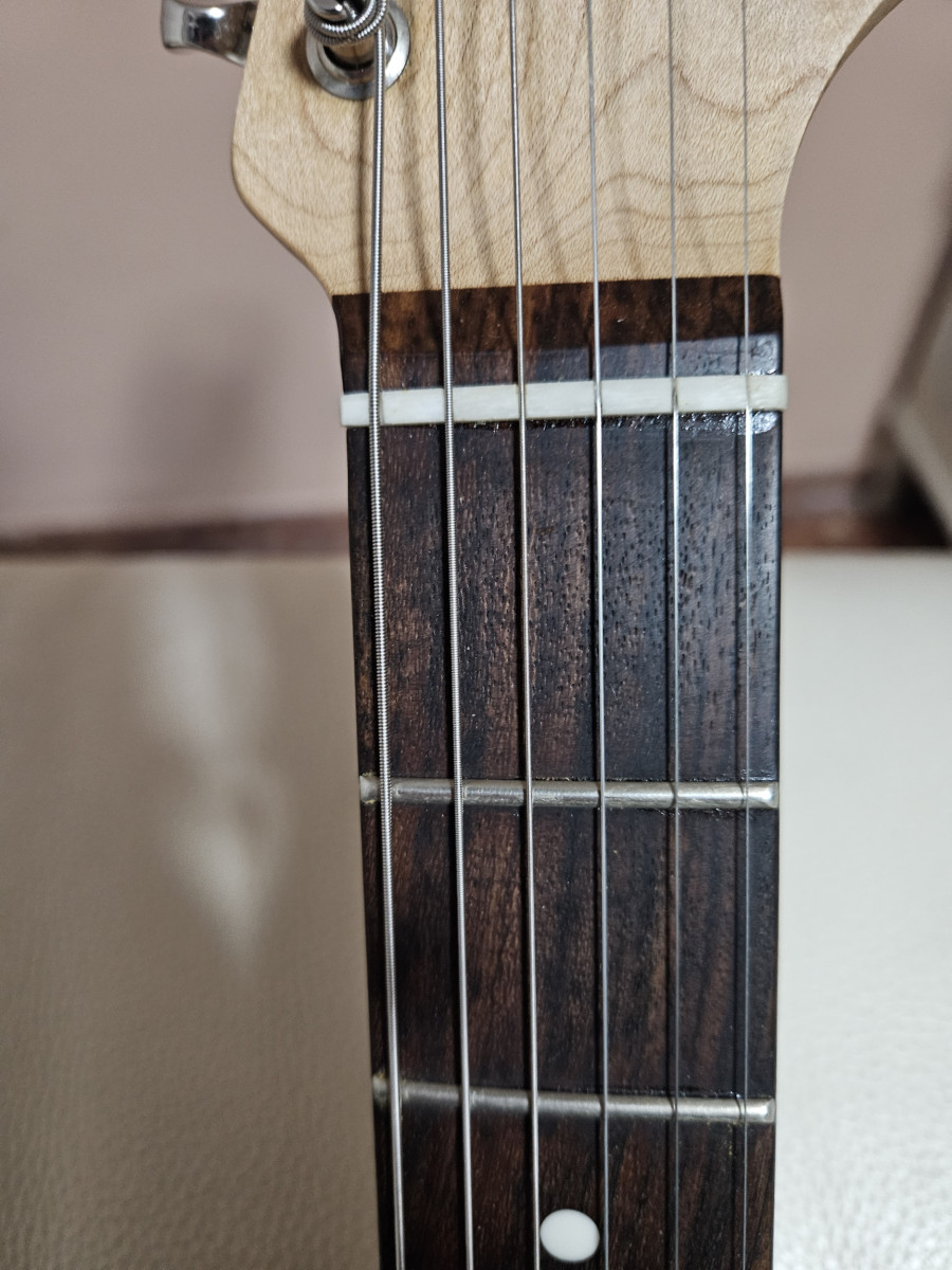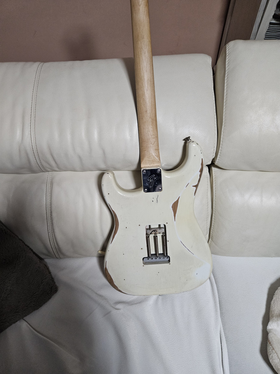 Stratocaster compuesta por cuerpo fender road worm relic original, con pastillas fender tex-mex y mastil göldo aleman con diapason de palo rosa con licencia fender , la guitarra lleva pegatinas totalmente removibles
