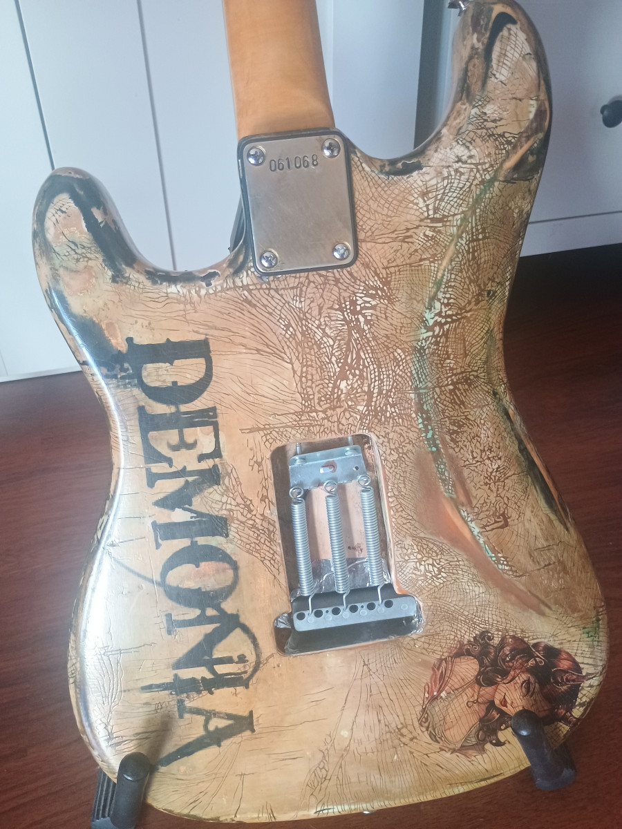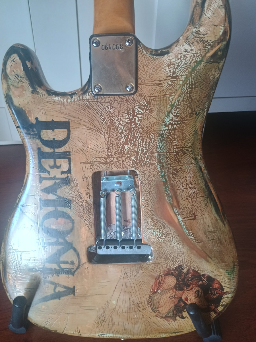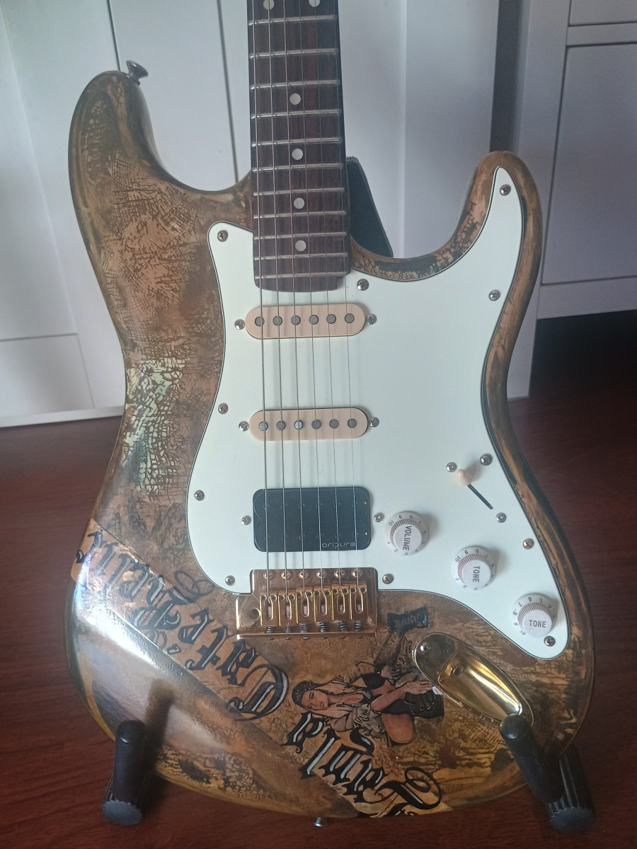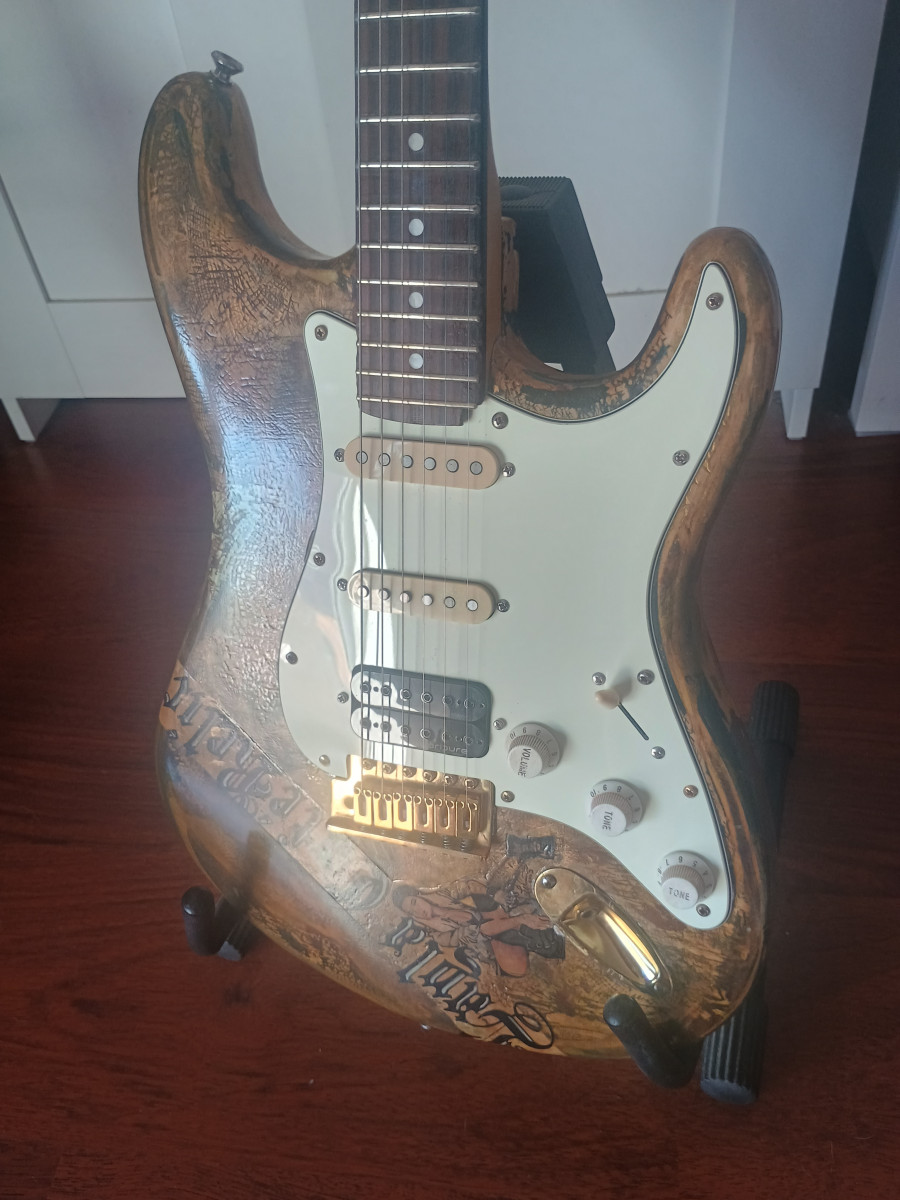 Stratocaster artesanal de luthier, el cuerpo tiene un acabado único, con muchas horas de trabajo, no sé si es de Aliso o de Fresno, pero me comentó que era de muy buena calidad , se la compré yo mismo , en el mastil ahora monta una pastilla de una Fender american standard de los 90 perfecta para blusear y ritmos con cuerpo, en la del puente tiene una Oripure que no veas como ruge y al mismo tiempo saca unos limpios muy buenos, el golpeador original se cambió , el cuerpo y el mastil son originales, se cambio algún traste y le falta un trozo al diapasón sin afectar al tocar , cualquier duda me comentáis.