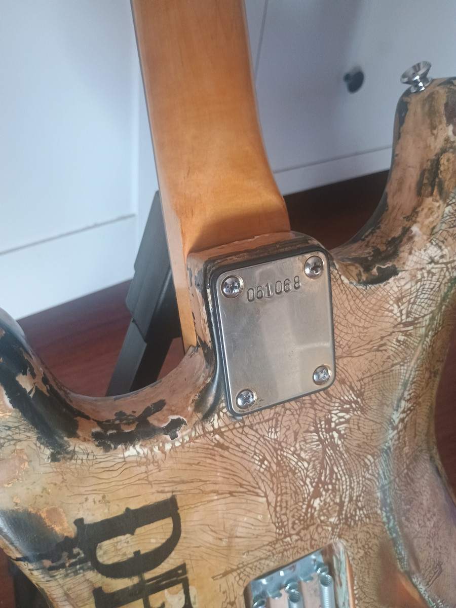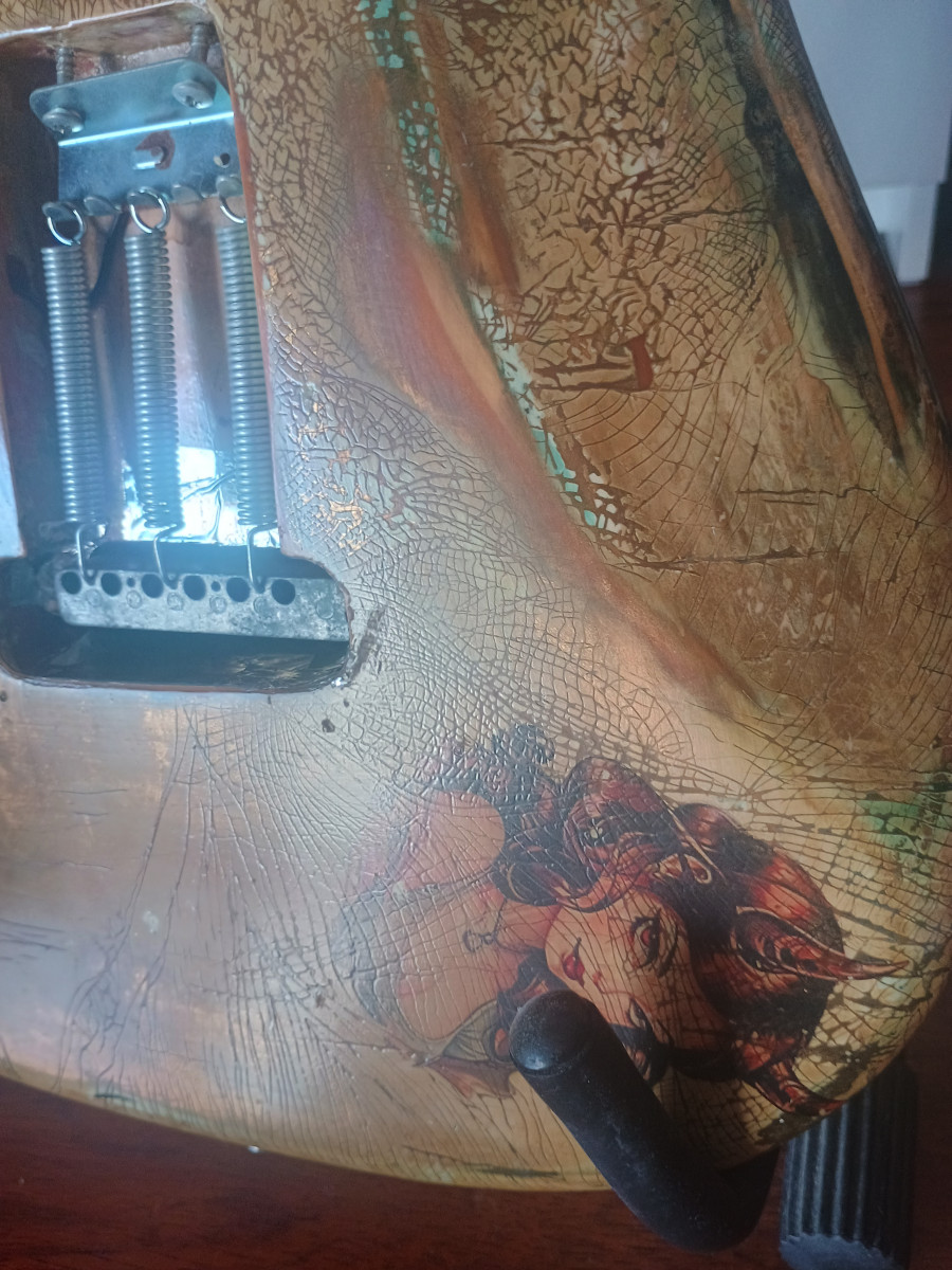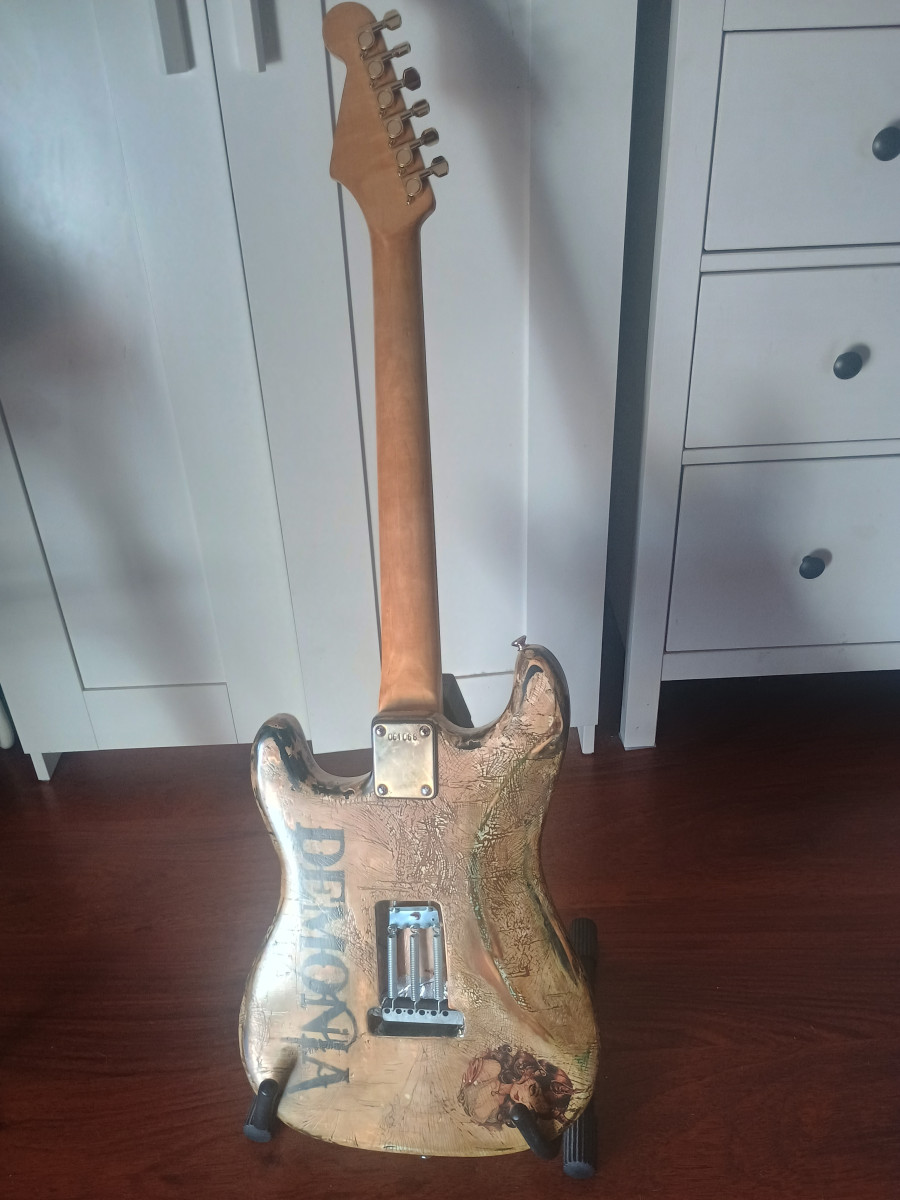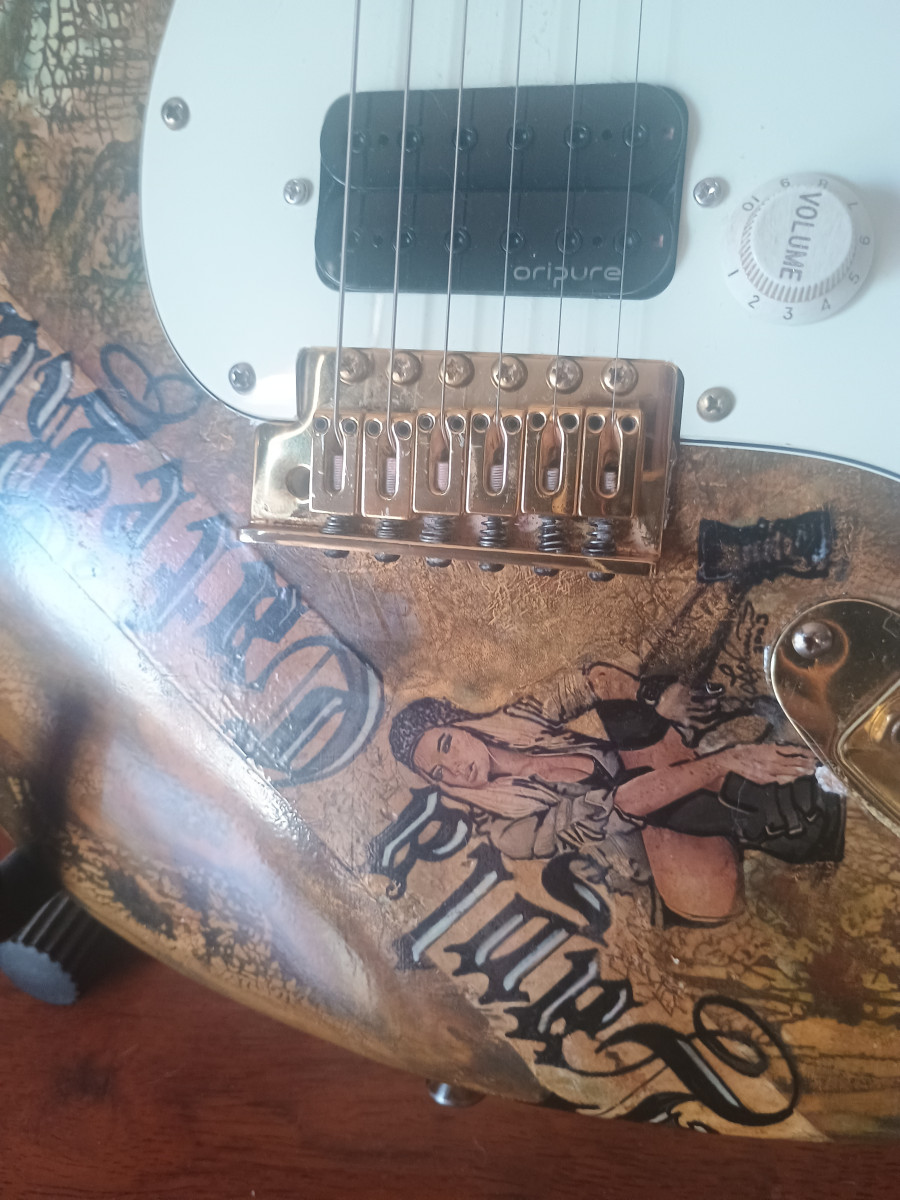 Stratocaster artesanal de luthier, el cuerpo tiene un acabado único, con muchas horas de trabajo, no sé si es de Aliso o de Fresno, pero me comentó que era de muy buena calidad , se la compré yo mismo , en el mastil ahora monta una pastilla de una Fender american standard de los 90 perfecta para blusear y ritmos con cuerpo, en la del puente tiene una Oripure que no veas como ruge y al mismo tiempo saca unos limpios muy buenos, el golpeador original se cambió , el cuerpo y el mastil son originales, se cambio algún traste y le falta un trozo al diapasón sin afectar al tocar , cualquier duda me comentáis.