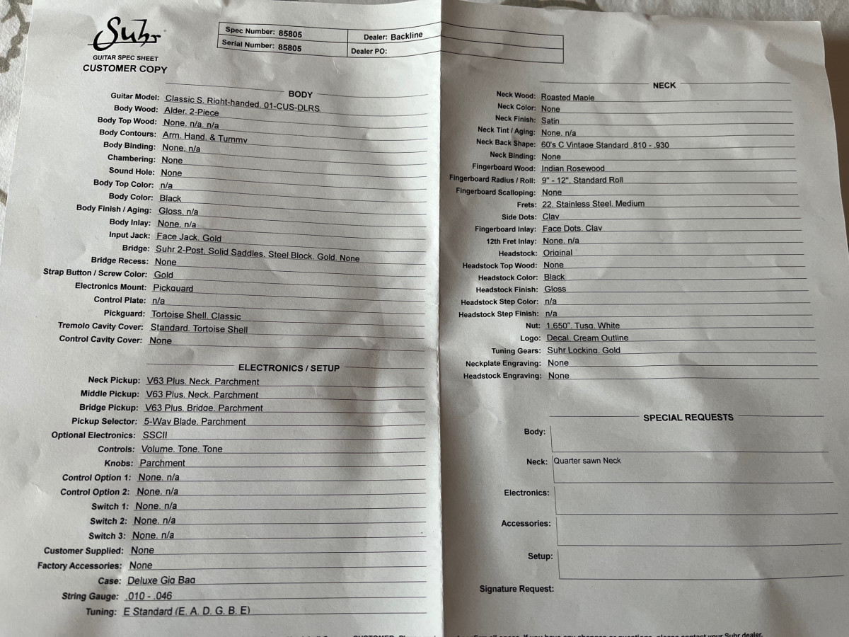 La guitarra suena y se toca de maravilla. Las specs son de fábula, roasted quartersawn neck, matching headstock, gold hardware.... Viene con funda de Suhr y todas las chuches.