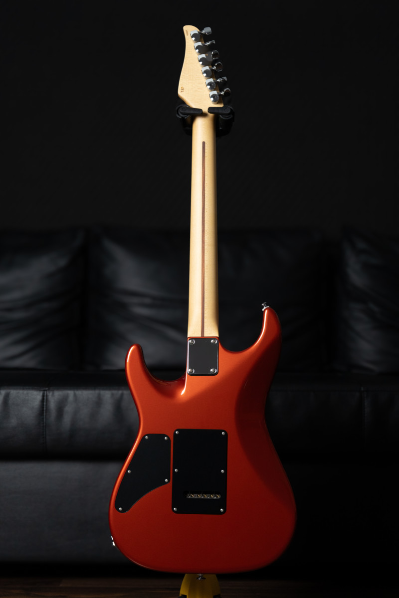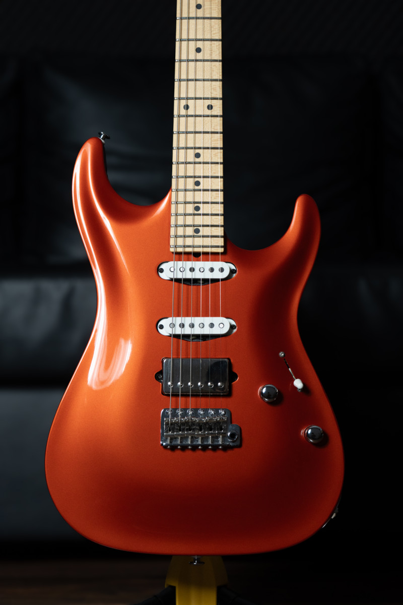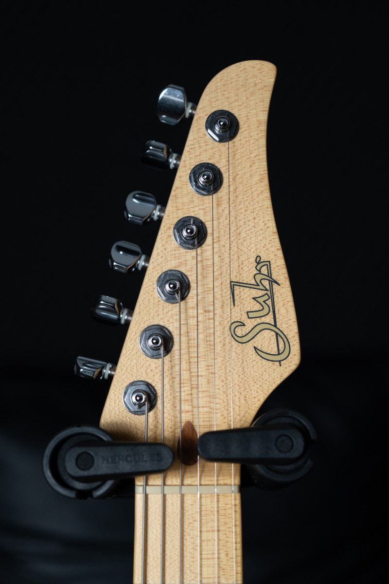 Alder body with that bitchin’ finish and 1 piece Quartersawn Maple neck cut in a super-fast modern elliptical carve – and sporting Suhr’s applauded rolled stainless steel jumbo frets – it’s Vai worthy, it’s Steve Stevens ready. Chrome hardware for awesome contrast to the finish, and screaming Suhr SSH pickups for articulation and punch…