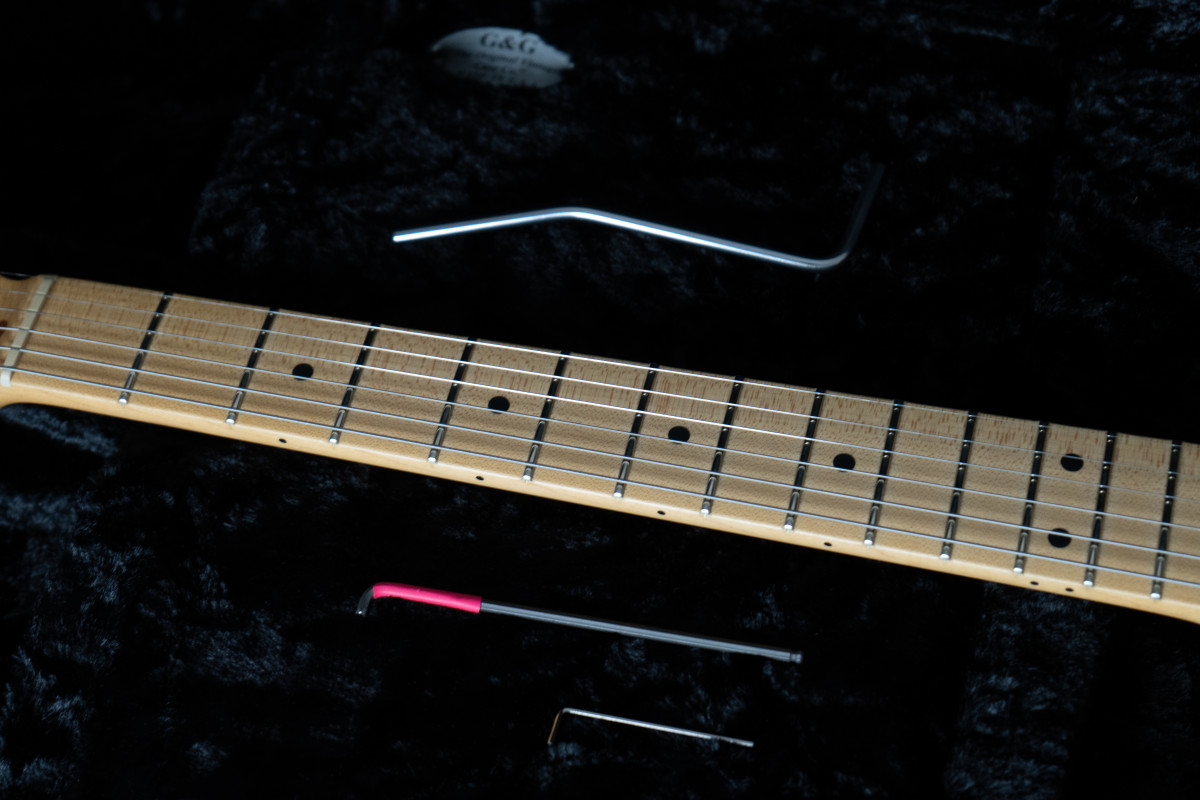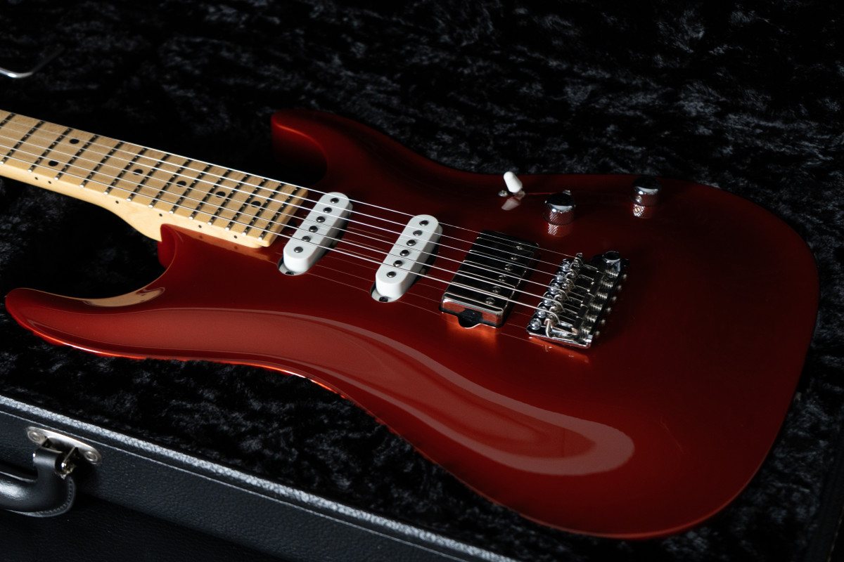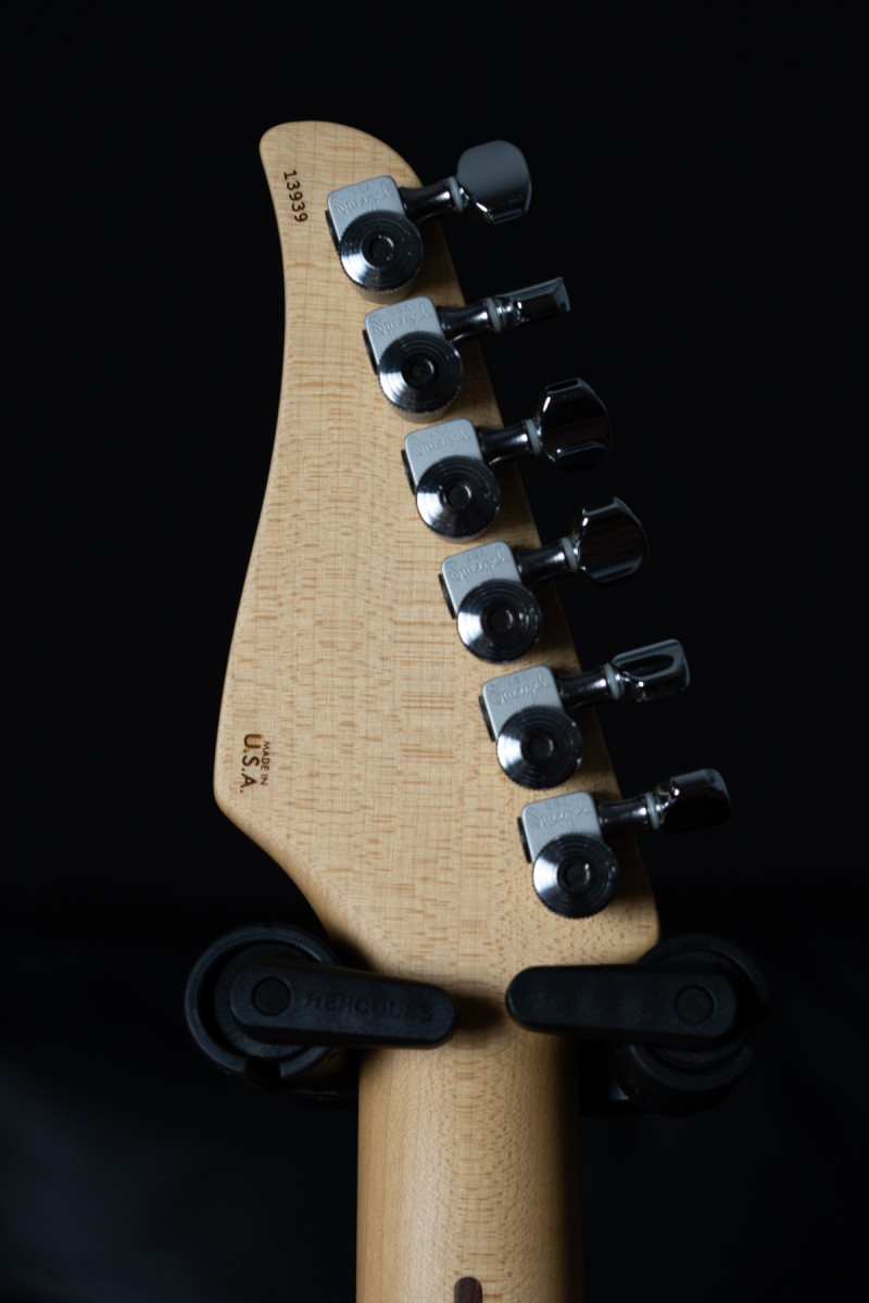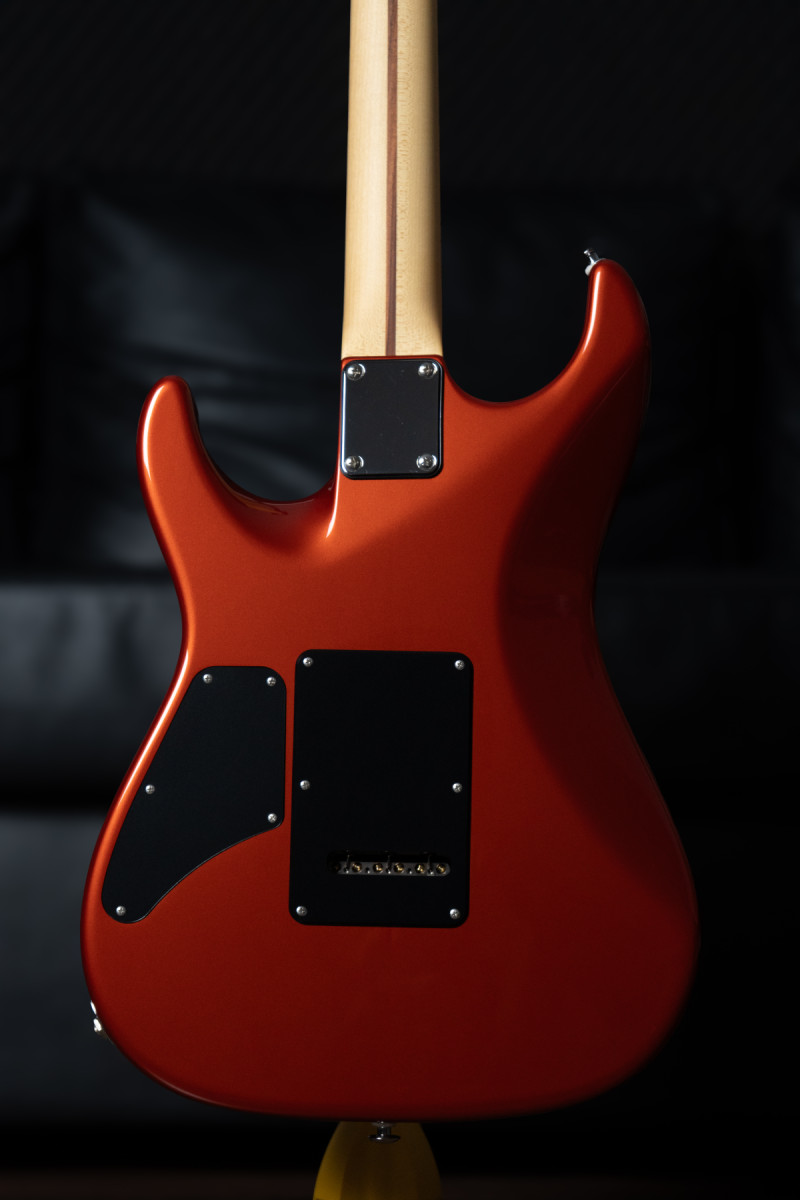 Alder body with that bitchin’ finish and 1 piece Quartersawn Maple neck cut in a super-fast modern elliptical carve – and sporting Suhr’s applauded rolled stainless steel jumbo frets – it’s Vai worthy, it’s Steve Stevens ready. Chrome hardware for awesome contrast to the finish, and screaming Suhr SSH pickups for articulation and punch…