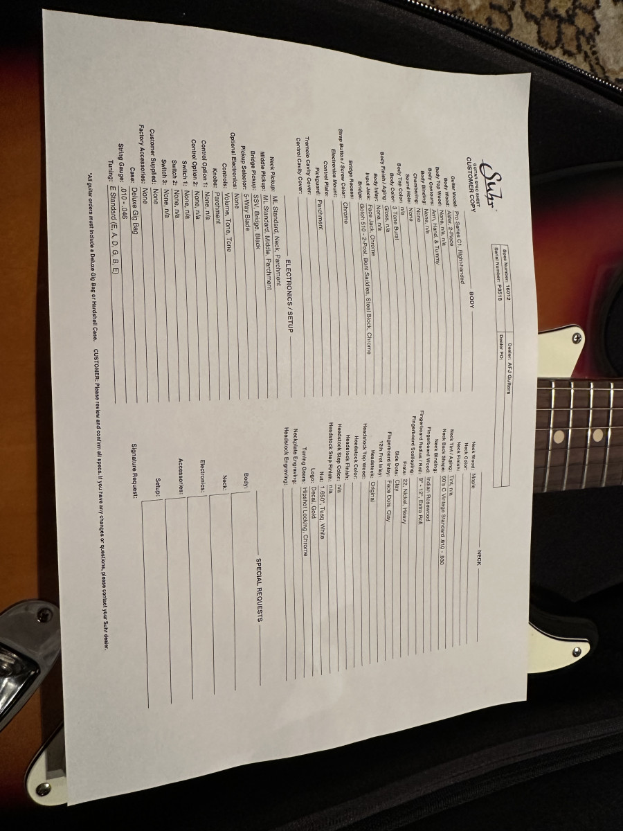 Pastillas Landau en las singles y SSV en el puente. Sus papeles y gigbag Suhr están incluidos. Todas las specs originales, que pueden comprobarse en la hoja adjuntada al final.