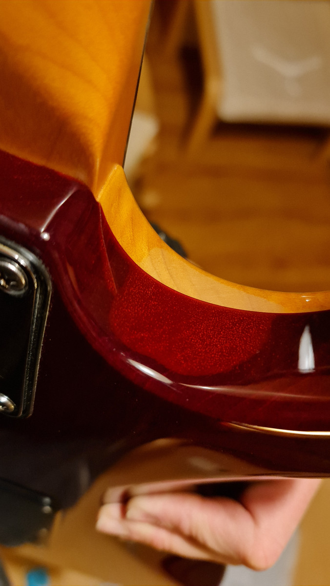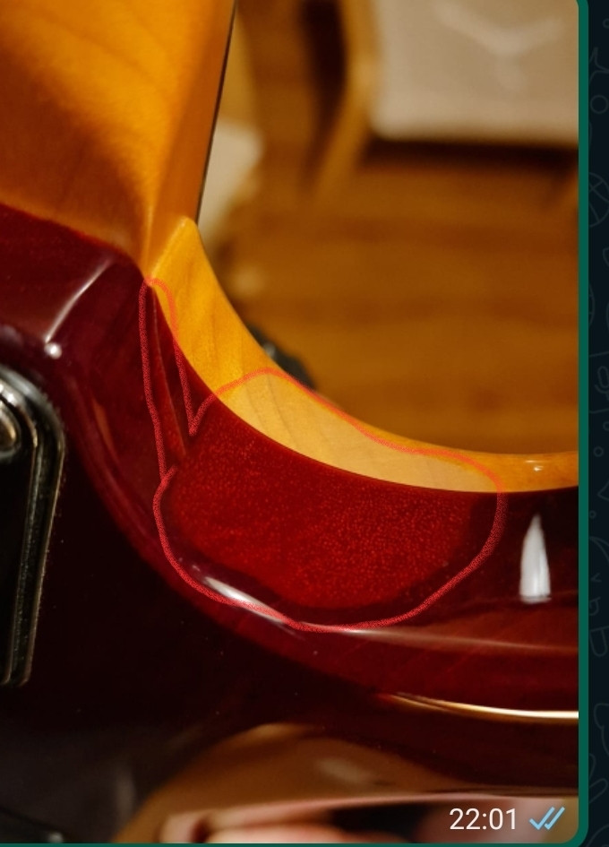 En perfecto estado salvo una decoloracion en el barniz cutaway inferior. No se nota al tacto ni ha crecido en tamaño, pero ahi esta. He tratado de reflejarlo en las ultimas fotos. El precio que pongo ya considera esto.