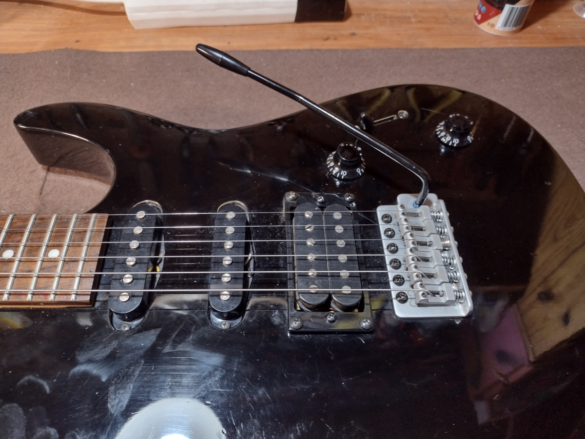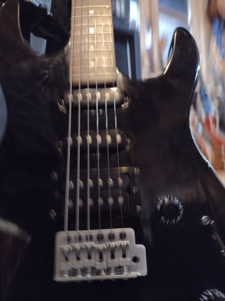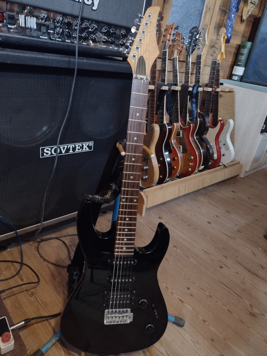 superstrato muy bien ajustada,mastil calibrado trastes coronados con dos sigles y un humbucker en el puente,cejuela de rodillos para que no desafine el tremolo, clavijeros grover,mastil bastante plano,todo el harvard en mate,lista para dar caña.