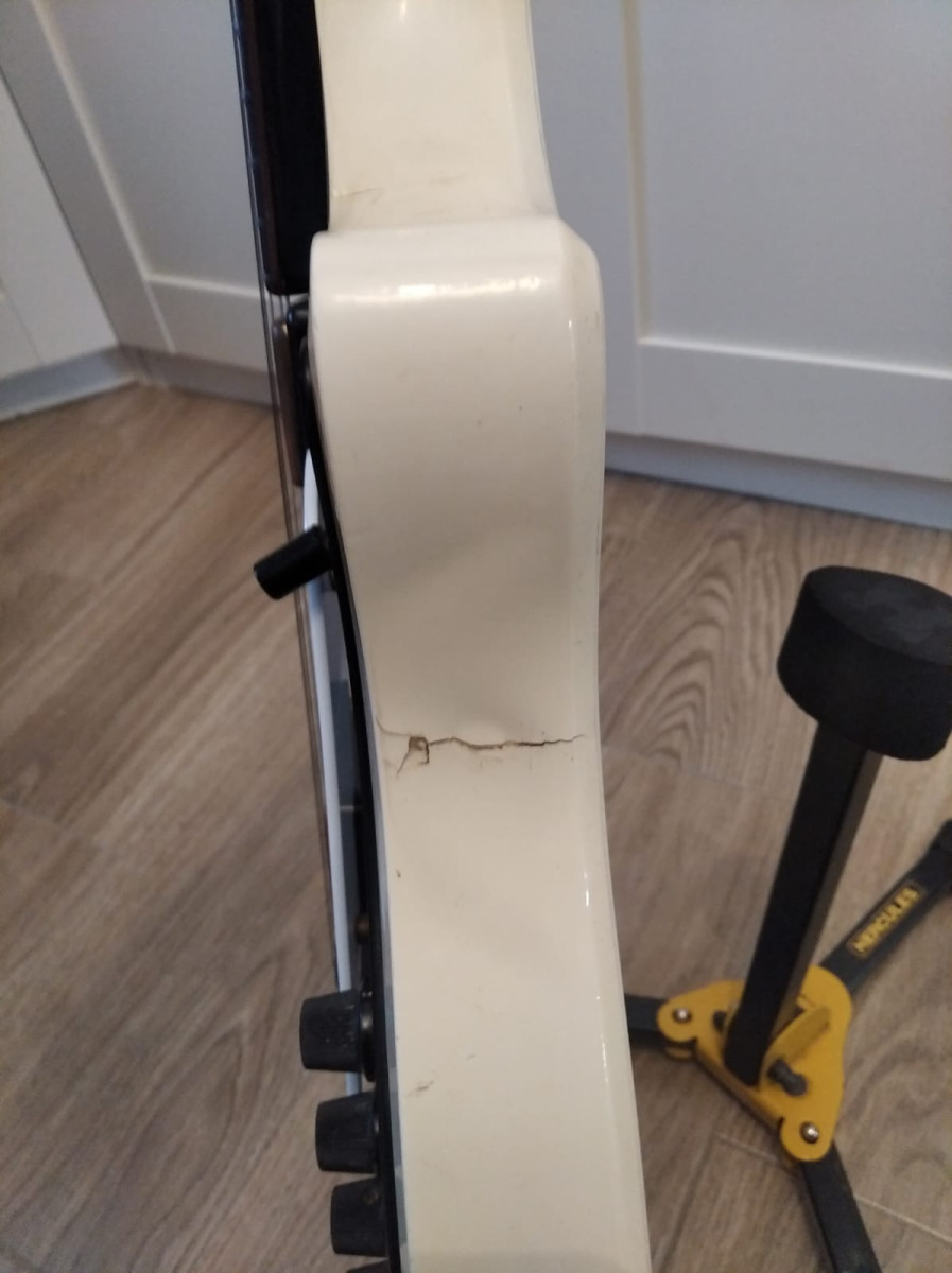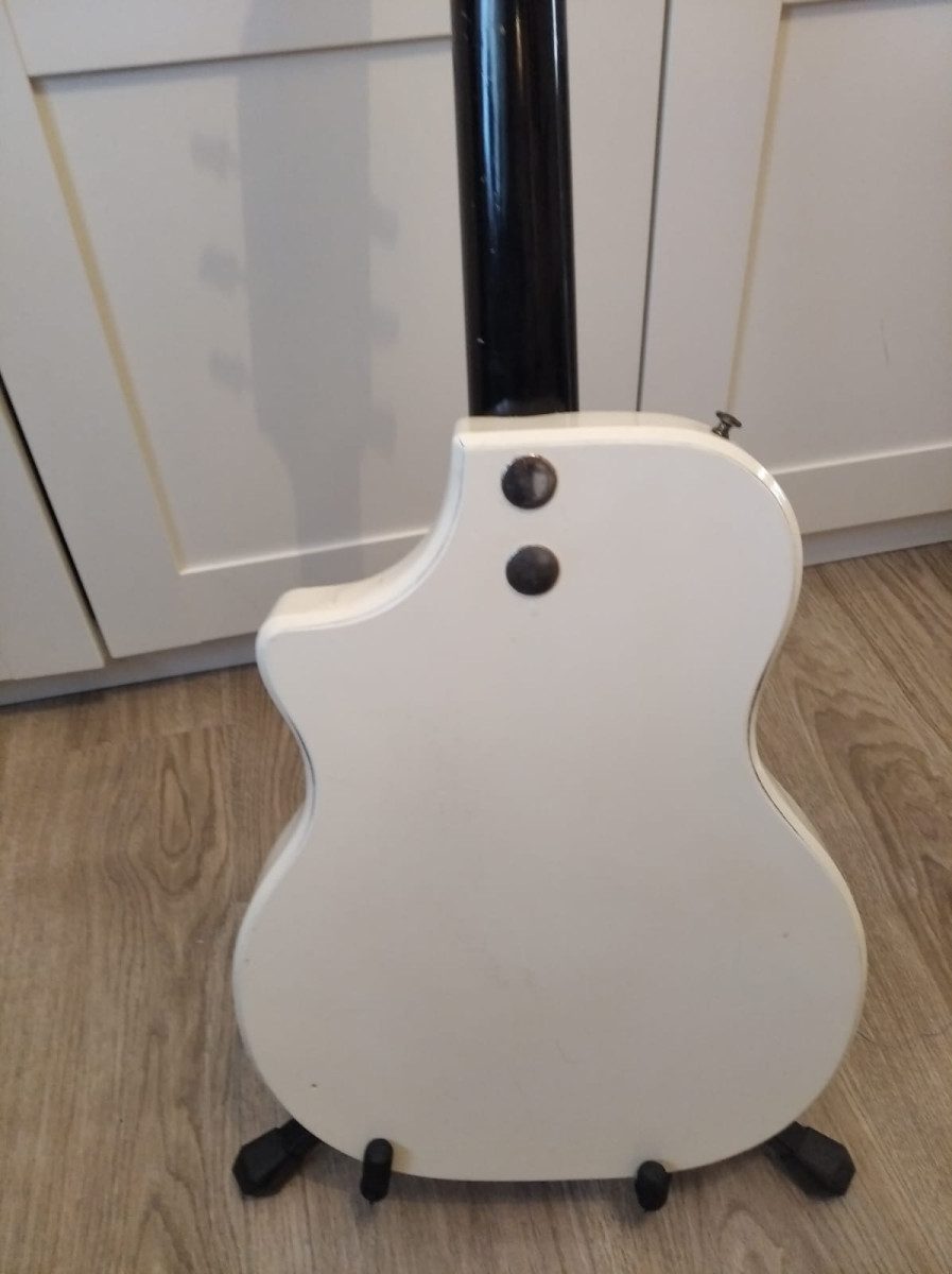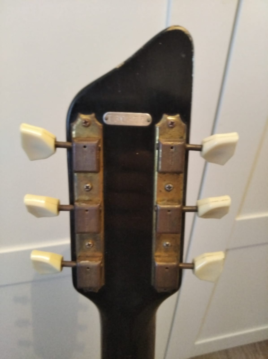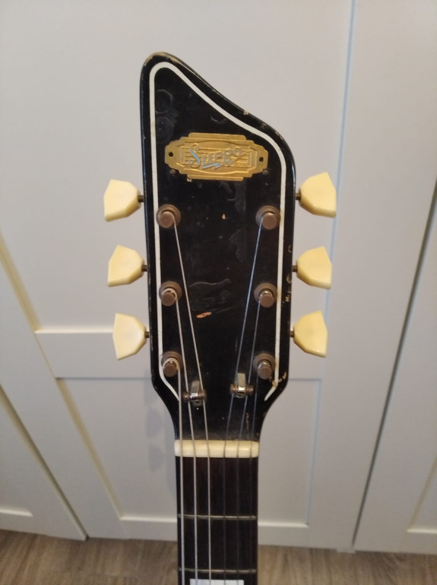 Supro Dual Tone made in the USA Valco / National VINTAGE año 1960. Todo original y en buen estado. Incluye estuche de época. Se le añadieron en la pala las dos guías para las cuerdas y cejuela de hueso hecha a mano por lutier. Tiene el plástico un poco levantado (ver foto) al lado del cutway que no afecta para nada al sonido. Las pastillas son single-coil, que suenan a gloria...Los trastes están en buen estado 75 % y el mástil se puede ajustar sin ningún problema. Quinta y entona perfectamente. y la acción (media, aunque se puede ajustar, claro) es súper cómoda. Ahora tiene cuerdas Daddario EXL110+. El clavijero no se desajusta y funciona a la perfección. La sección del golpeador que sujeta el jack de salida se ha sustituido por una placa de aluminio. Guitarra con mucha personalidad y un tonazo espectacular.