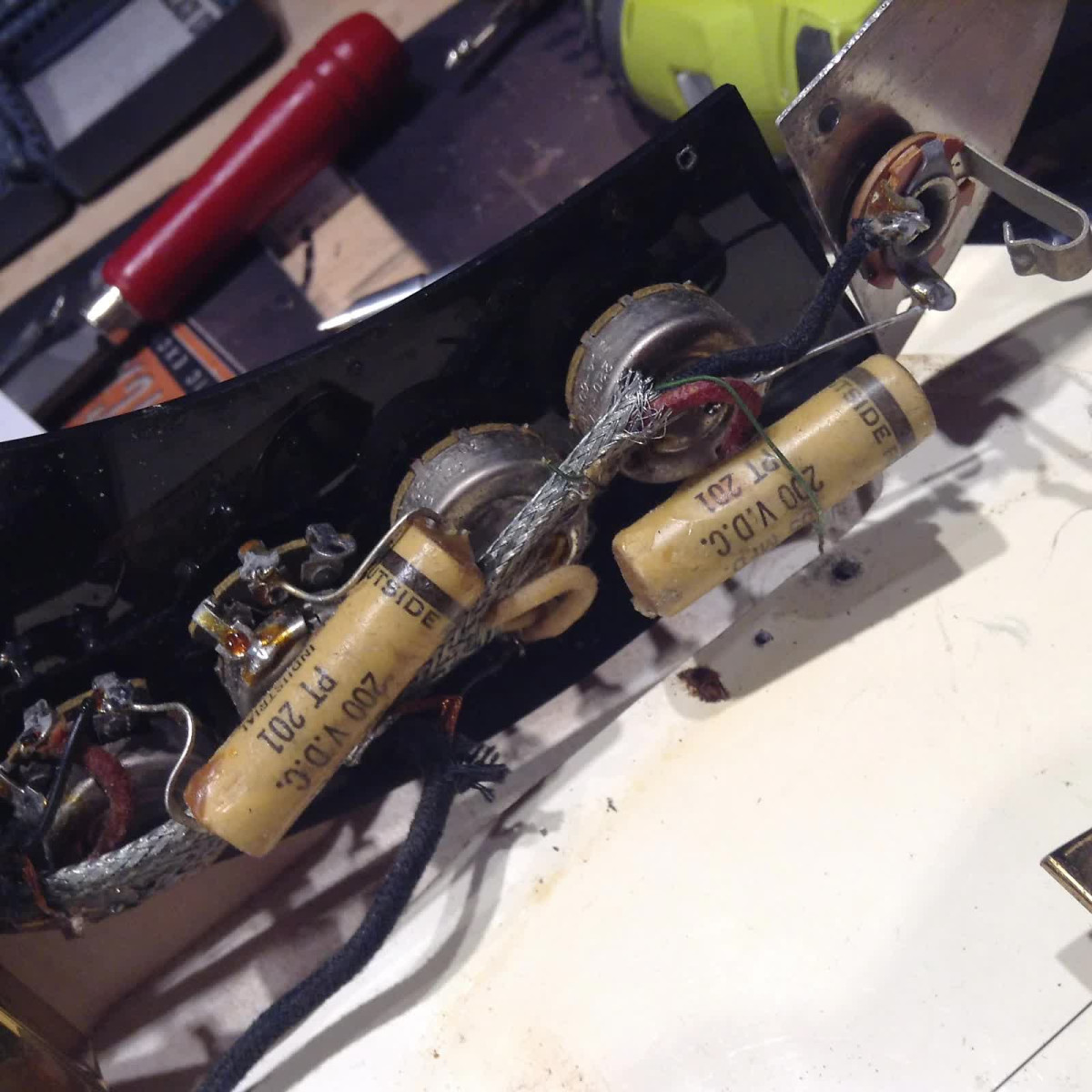 Pastillas/Herrajes: Puente y clavijeros originales, pastillas originales (de 9,6 kOhm en el mástil y 9 kOhm en el puente), selector de pastillas de tres posiciones, controles independientes de volumen y tono.