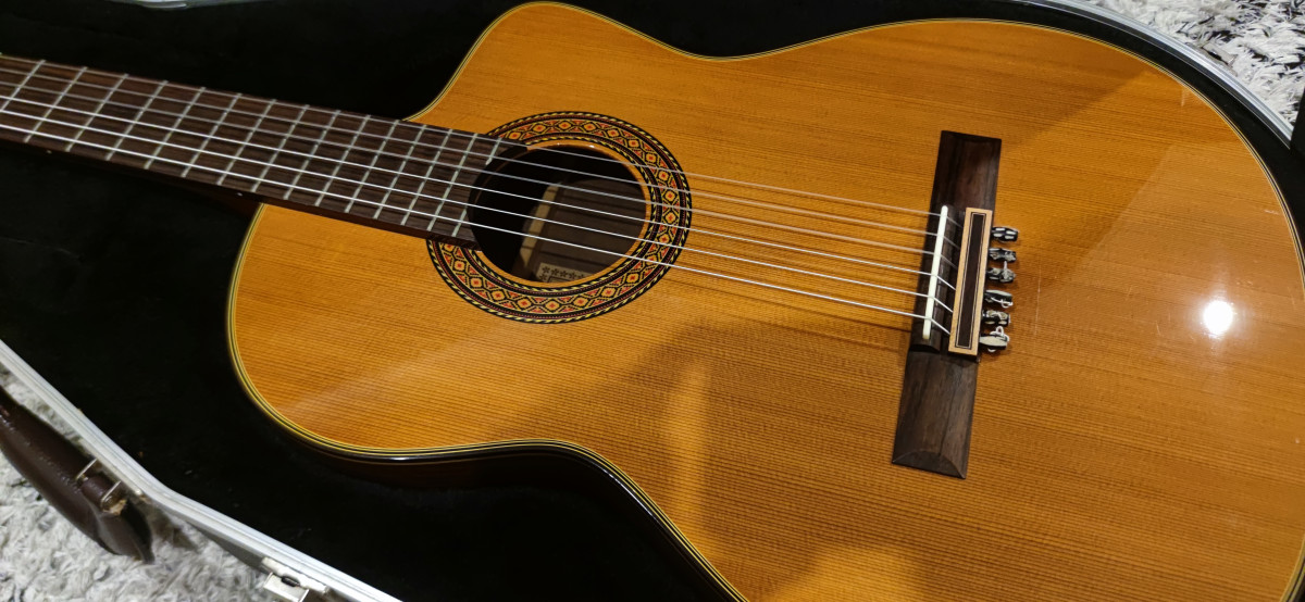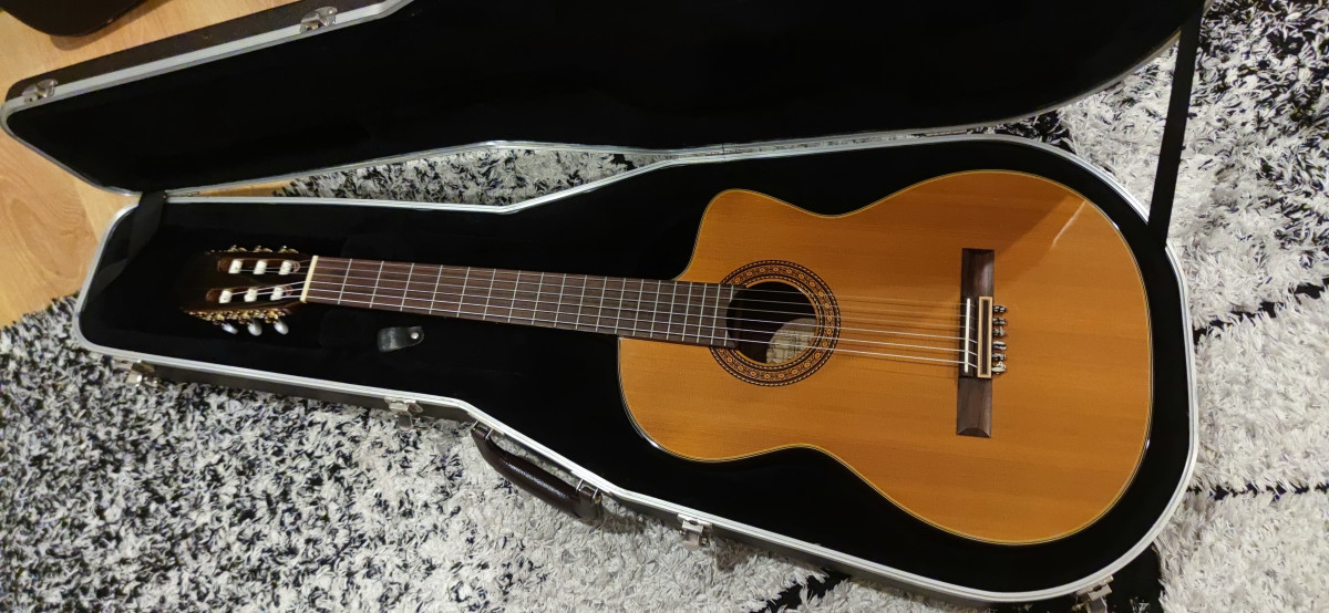 Guitarra clásica de nylon con cutaway, tapa de cedro sólido y aros/fondo de caoba. Sonido cálido, definido y con mucha proyección.