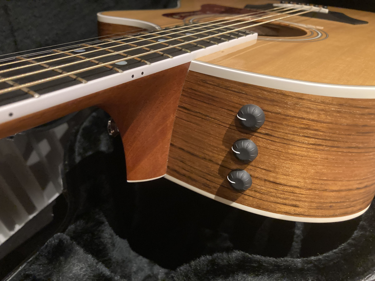 Esta edición Studio cuenta con un cuerpo en acabado brillo que le añade atractivo estético a la par que aporta durabilidad. Por su parte, el diapasón de ébano Crelicam de África Occidental permite una ejecución fluida y se complementa con elegantes incrustaciones de acrílico italiano en forma de puntos de 4 mm. Además, las clavijas de níquel Taylor brindan una estabilidad de afinación fiable, en tanto que la electrónica ES2 integrada capta la voz acústica natural de la guitarra con claridad.