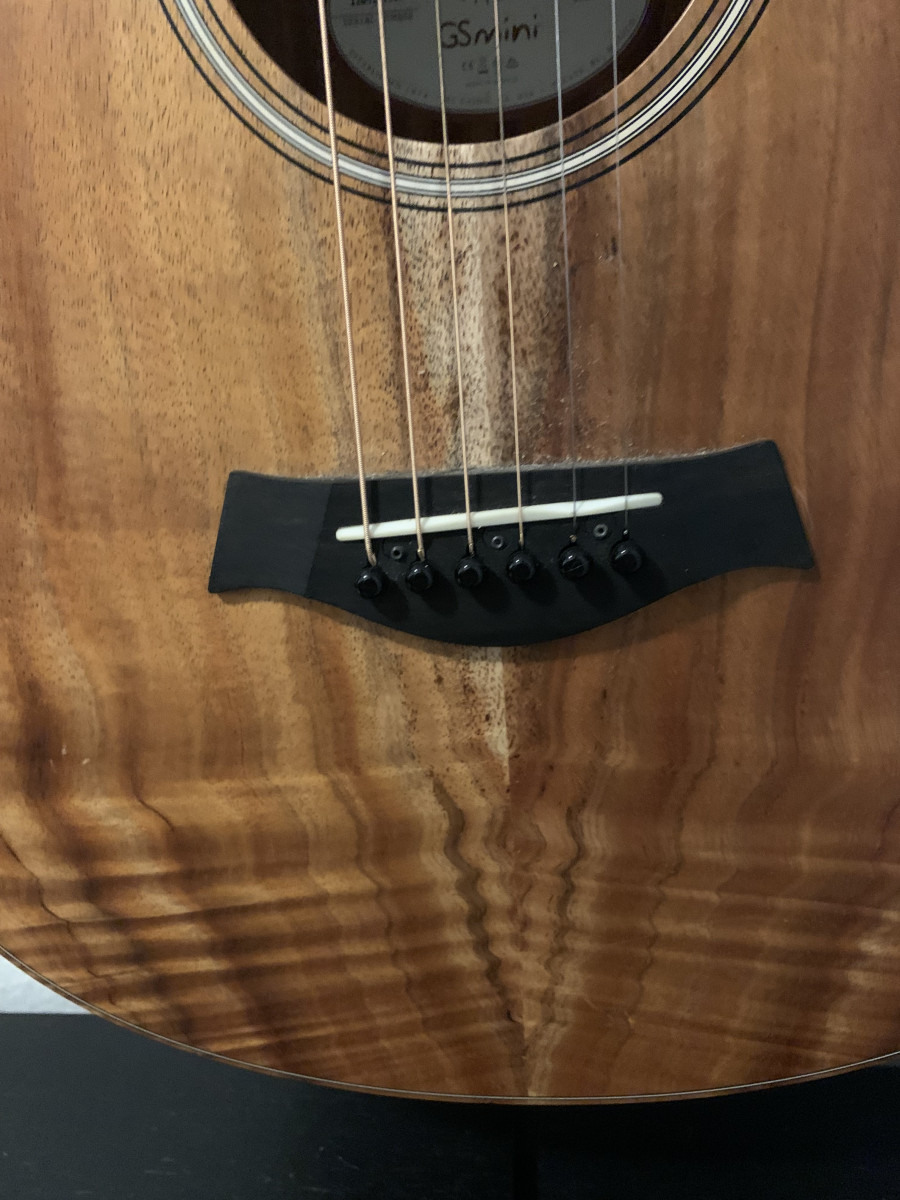 Vendo esta espectacular guitarra acústica Taylor GS Mini-e Koa, con un veteado la mar de bonito. Ideal tanto para músicos que viajan como para quienes buscan un instrumento cómodo sin sacrificar calidad de sonido. Graves especialmente llamativos para una guitarra de este tipo. Fabricada con tapa sólida de koa hawaiana, esta guitarra no solo suena increíblemente rica y cálida, sino que además luce espectacular gracias a las vetas exóticas de la madera.