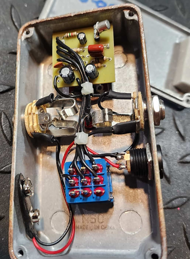Es un booster-drive con componentes tradicionales (no SMD como algunos de Mythos o T-Rex) y con transistor NPN (ver fotos).