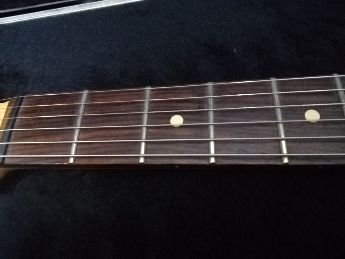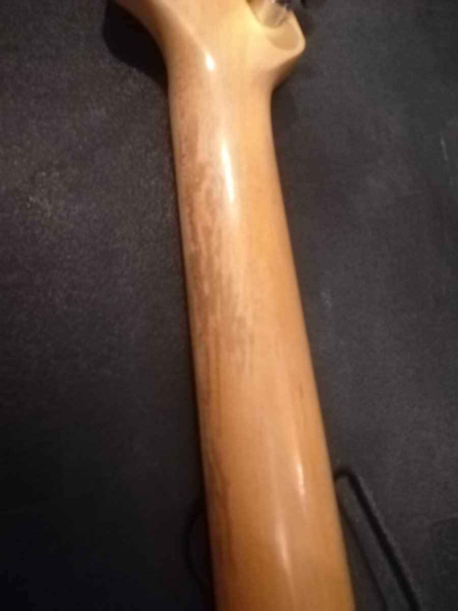 -Mástil Warmoth USA perfil Fatback. 22 trastes. De arce con diapasón de palorrosa. Ajuste de alma en dos puntos (zoque y lateral del zoque). Radio Warmoth (compuesto de 10 a 16"). Ancho cejuela (medido me da 41,80mm, a efectos de pedido son 42mm, o 1,650") Trastes 6100. Barniz muy fino (no es nitro pero tiene una capa fina). Se ha relicado ligeramente el barniz en algunas zonas del uso. Al mástil le hizo un nivelado David Rossi cuando lo compré nuevo. Lleva clavijeros Sperzel USA de bloqueo. Trastes prácticamente sin marcar (toda la vida por delante) Muy buena acción sin trasteos.