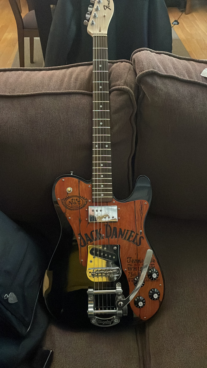 Fender Telecaster, custom’72 con Bigsby fabricada en México y mástil cambiado por un Fender más plano de diapasón oscuro, que se puede ver en las fotos, comparado con el claro que tiene + “C” curvatura por lo que no se podía hacer bending. El díapasón oscuro que aparece en las fotos es el nuevo mástil ... incluye tres diferentes golpeadores y estuche blando.