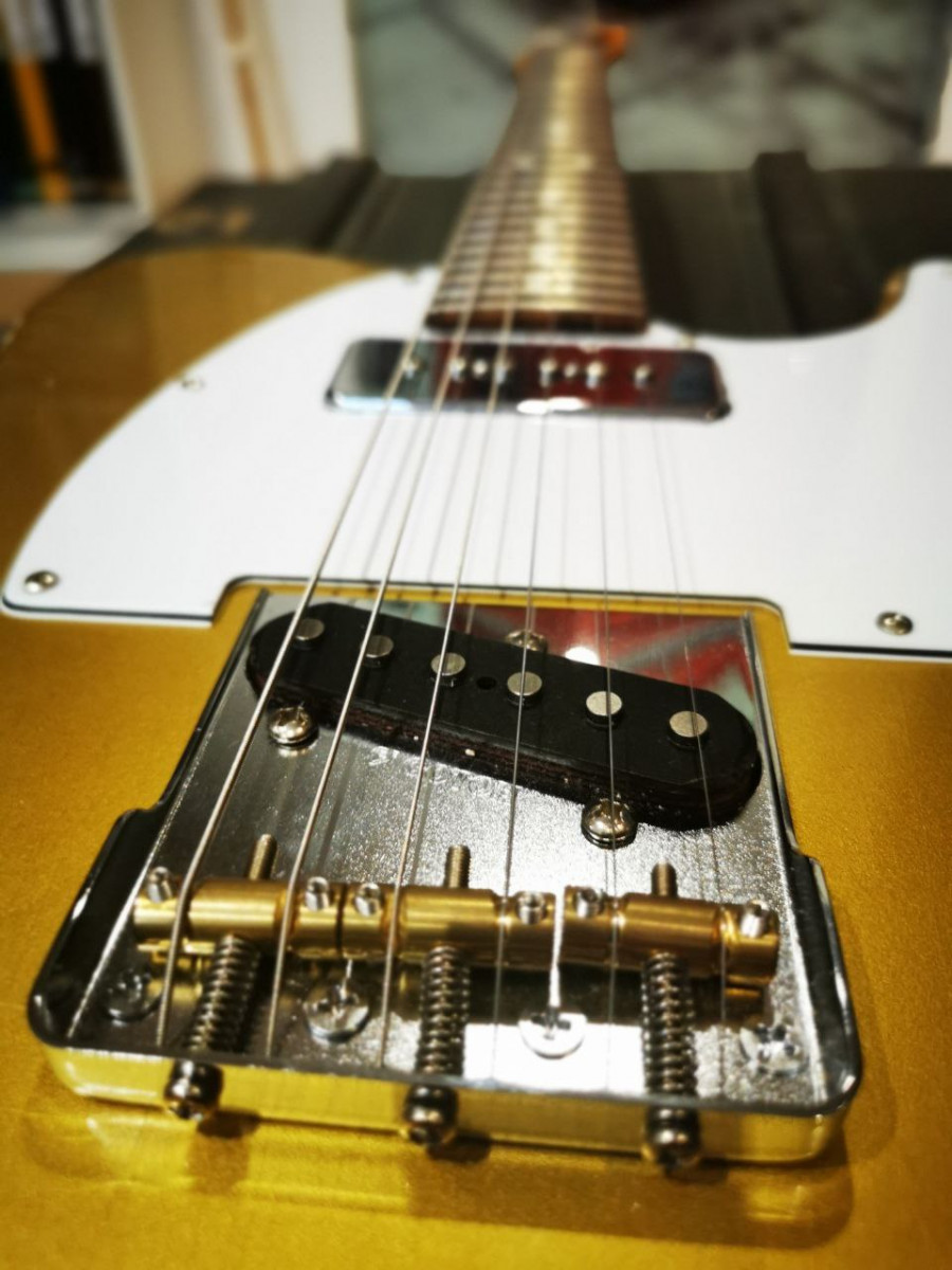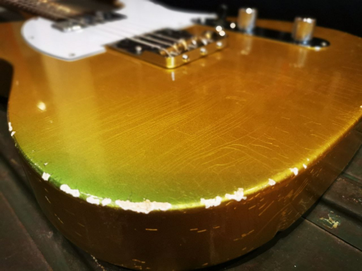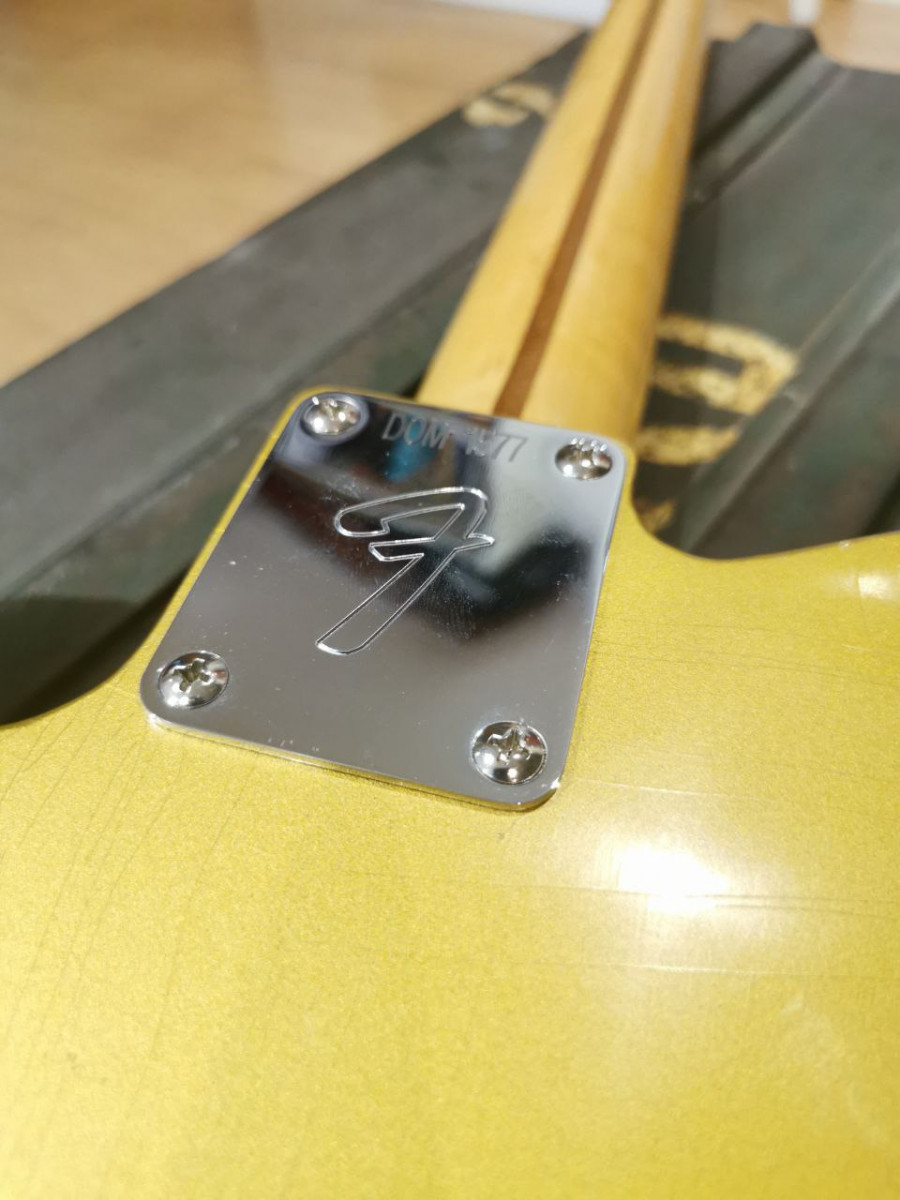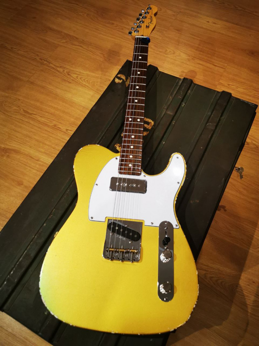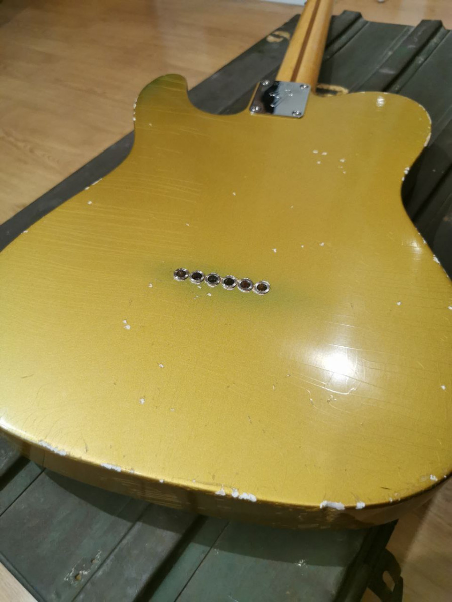 Mástil Fender USA radio 9,5 y selletas de hueso, cuerpo de swamp ash MJT dorado escogido especialmente para este mástil, con un relic precioso y muy ligero.