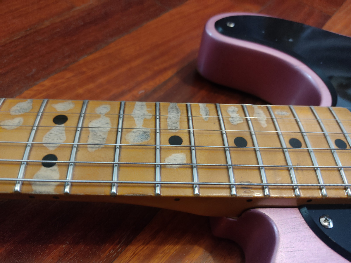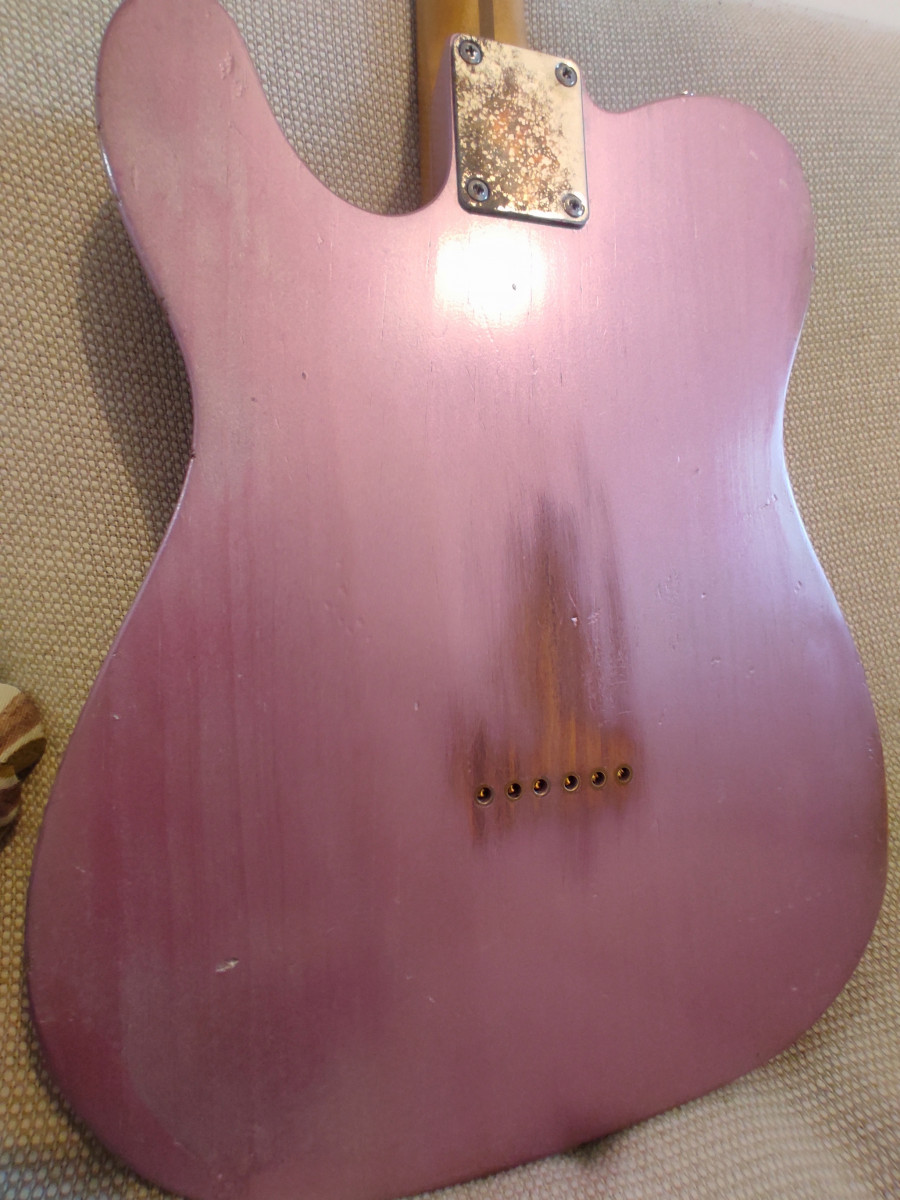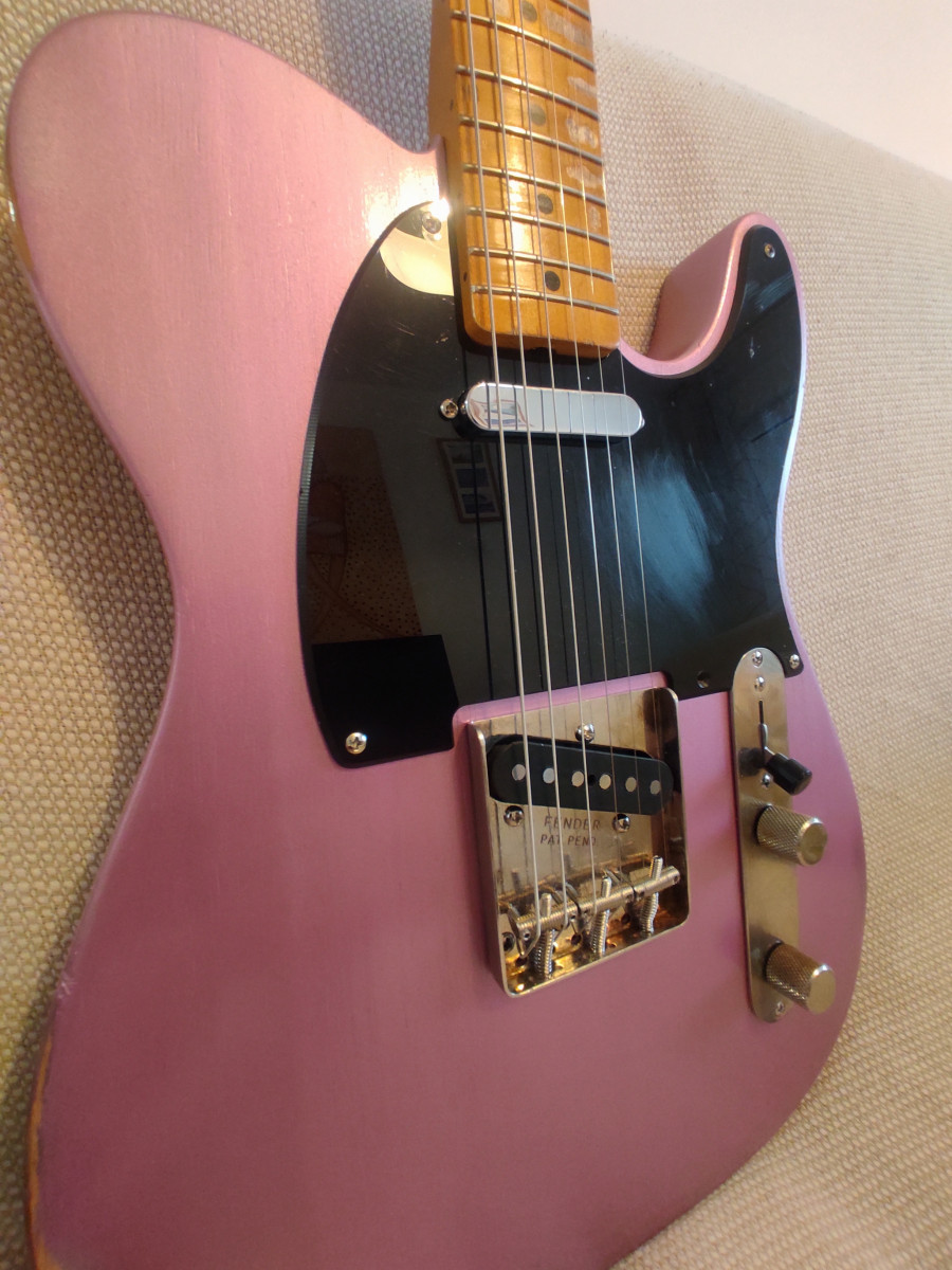 Telecaster montada con mástil Fender Esquire radio 7'25" y perfil C bastante gordo. Todo el relic es artificial,los trastes están al 100x100, está relacado a nitro. Cuerpo de una Squier CV 50 del 2023 decapado y pintado en nitro color Burgundy mist Metallic, el relic del cuerpo también es artificial. Monta unas fender Tex Mex con un puente Fender original y selletas ranuradas Fender USA. Si se envía iría muy bien envuelta en papel burbuja ,funda blanda y caja. Para cualquier cosa no dudéis en contactar. No busco cambios de ningún tipo. Saludos.