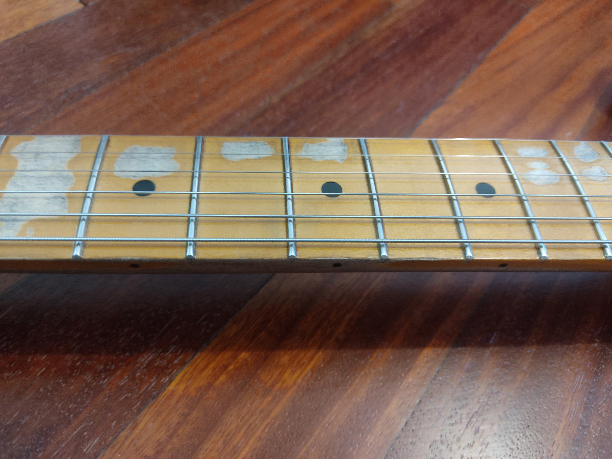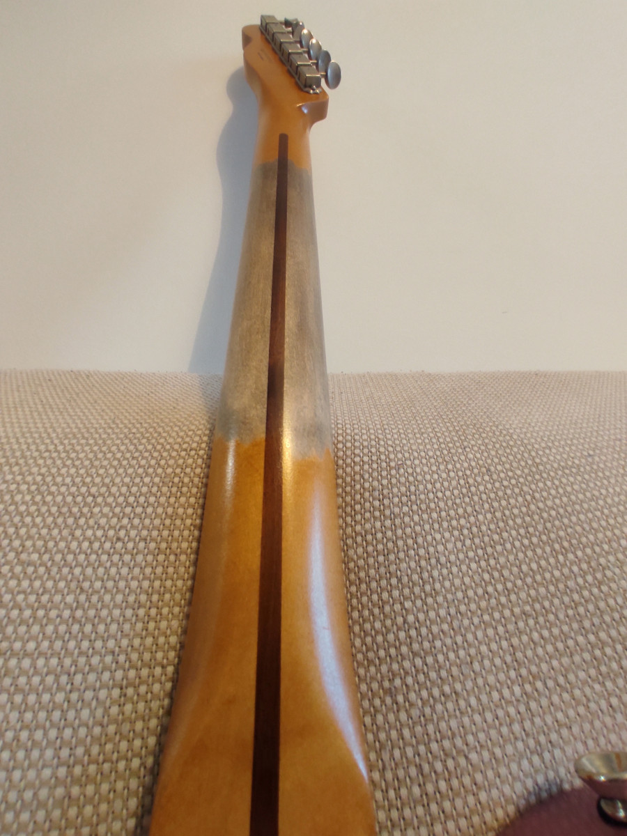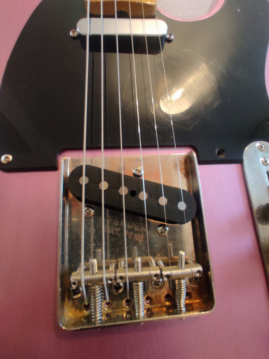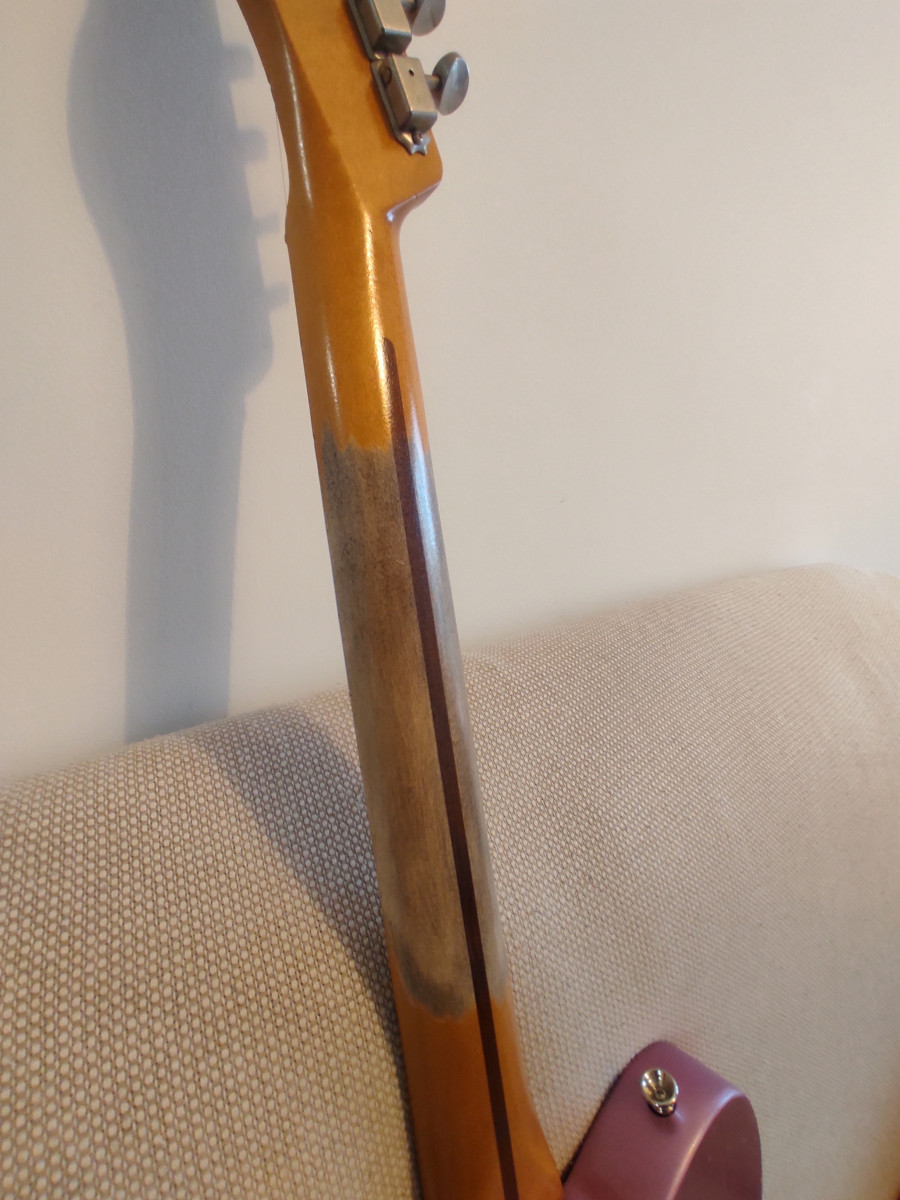 Telecaster montada con mástil Fender Esquire radio 7'25" y perfil C bastante gordo. Todo el relic es artificial,los trastes están al 100x100, está relacado a nitro. Cuerpo de una Squier CV 50 del 2023 decapado y pintado en nitro color Burgundy mist Metallic, el relic del cuerpo también es artificial. Monta unas fender Tex Mex con un puente Fender original y selletas ranuradas Fender USA. Si se envía iría muy bien envuelta en papel burbuja ,funda blanda y caja. Para cualquier cosa no dudéis en contactar. No busco cambios de ningún tipo. Saludos.