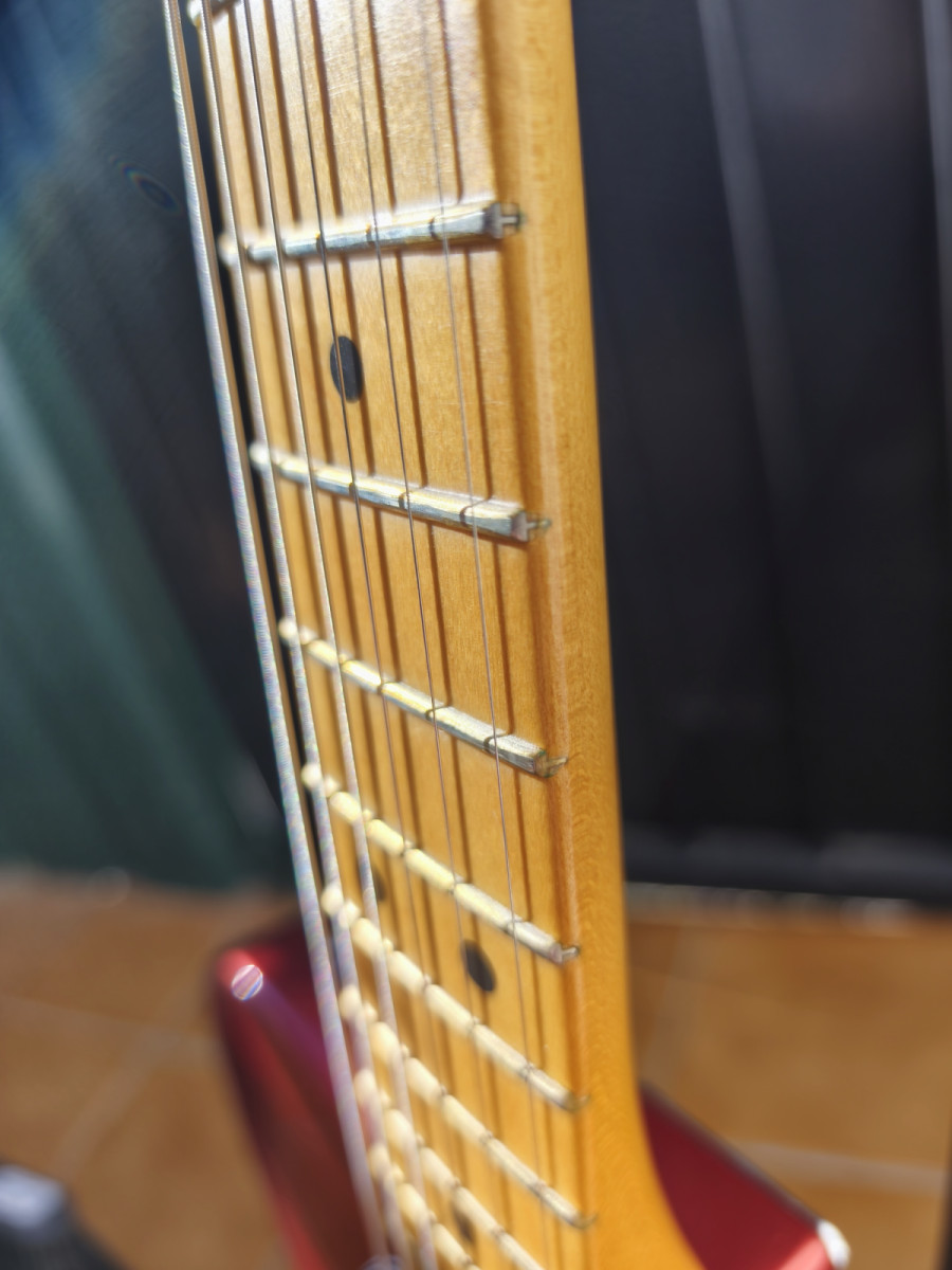 En muy, muy buen estado. Con apenas marcas de haber tocado. Perfectamente ajustada con cuerdas nuevas Elixir 9.46.