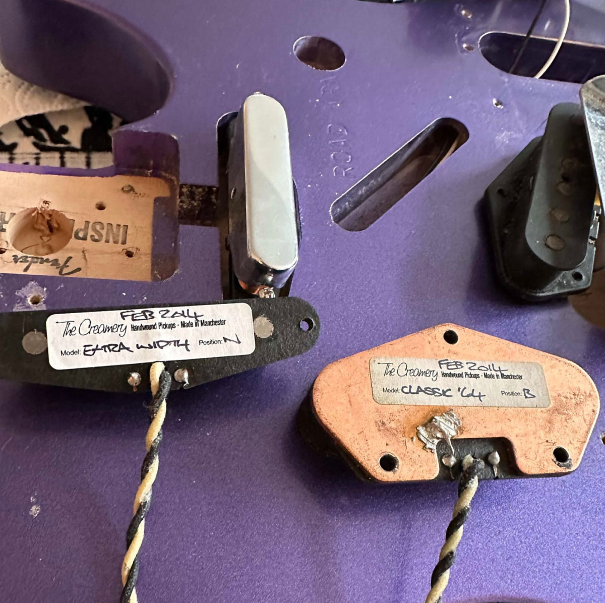 Lleva montadas unas pastillas boutique bobinadas a mano de Creamery Pickups: Classic 64 en el puente y Extra Width en el puente.