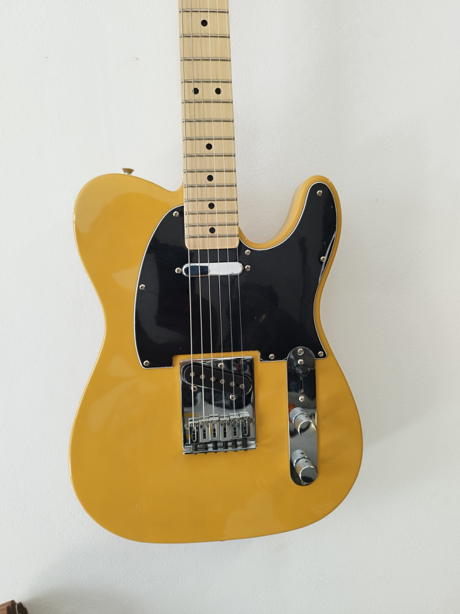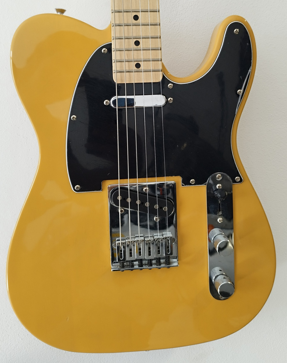 Cuerpo de Álamo acabado en poliuretano color rubio caramelo brillante, puente Tele® de 6 selletas con cuerdas a través del cuerpo. Pastilla del puente: bobina simple de cerámica. Diapasón :Arce. Radio del diapasón:9,5". Aún conserva el plástico del pickguard. Cuerdas nuevas del 0.9. Envío a Toda España a prueba de bombas