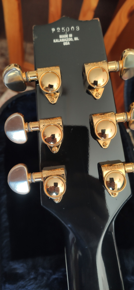 Caoba de Honduras y tapa de arce, diapason de ebano, puente y cordal Schaller, clavijero Grover. Se le han cambiado los potes y condensadores originales, ahora lleva CTS de 500k y condensadores Jupiter.