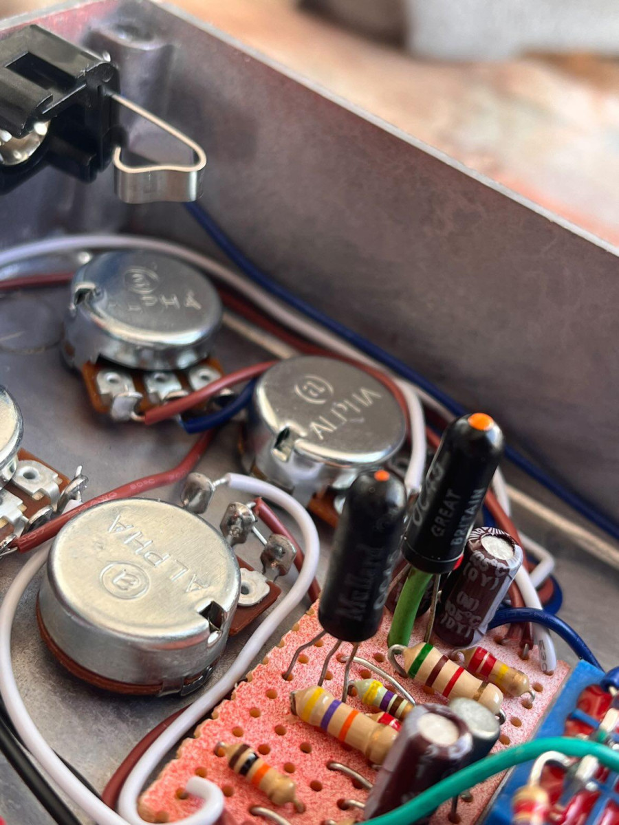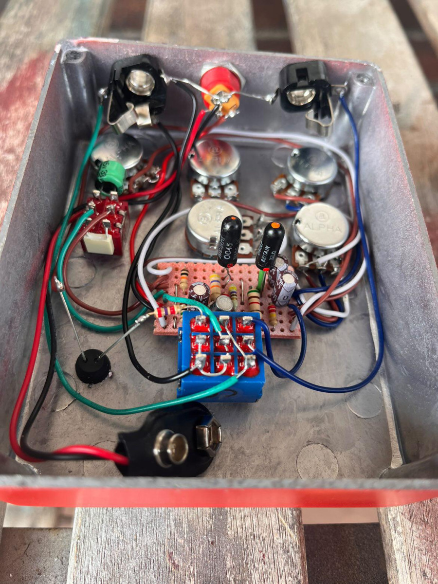 Con trío de transistores seleccionados, un CDIL 2n2222a (silicio) y 2 Mullard OC45 (germanio). Tendremos algo más de estabilidad ante distintas temperaturas que con un Fuzz Factory normal.