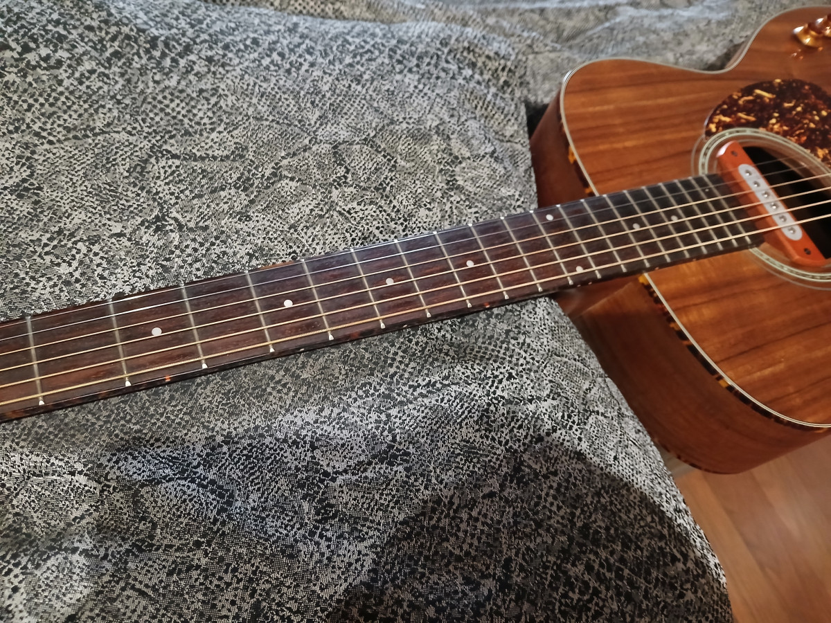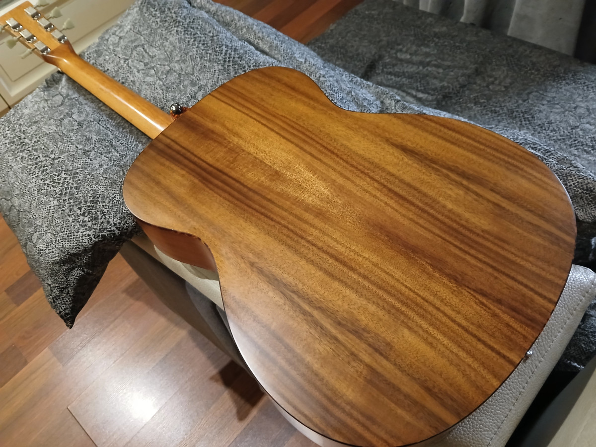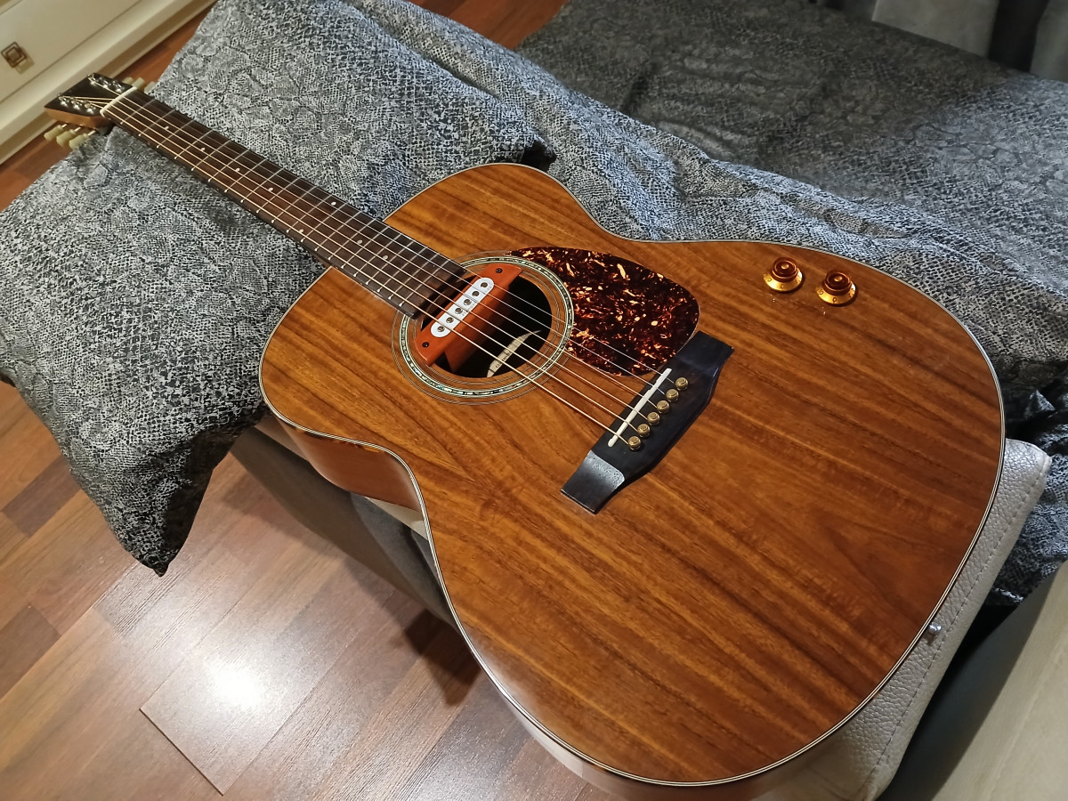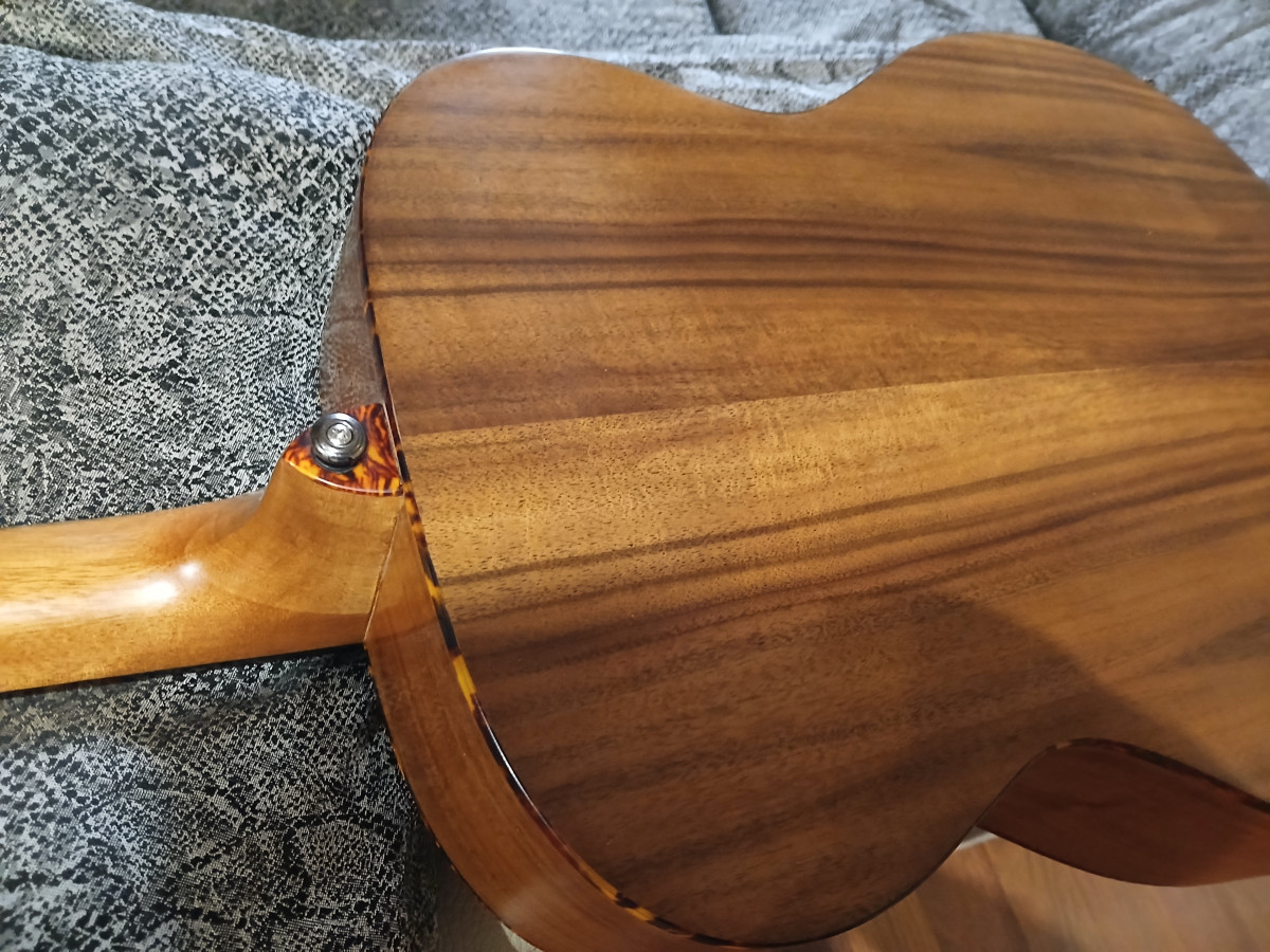 Caja de resonancia de Koa Hawaiana laminada, mastil de caoba, diapasón y puente de palisandro, binding de carey, incrustaciones de nácar, clavijeros Grover tipo kluson vintage. Mejorada con pines de latón y pastilla Flanger f-02, volumen, tono y electrónica completa, todo por profesional.