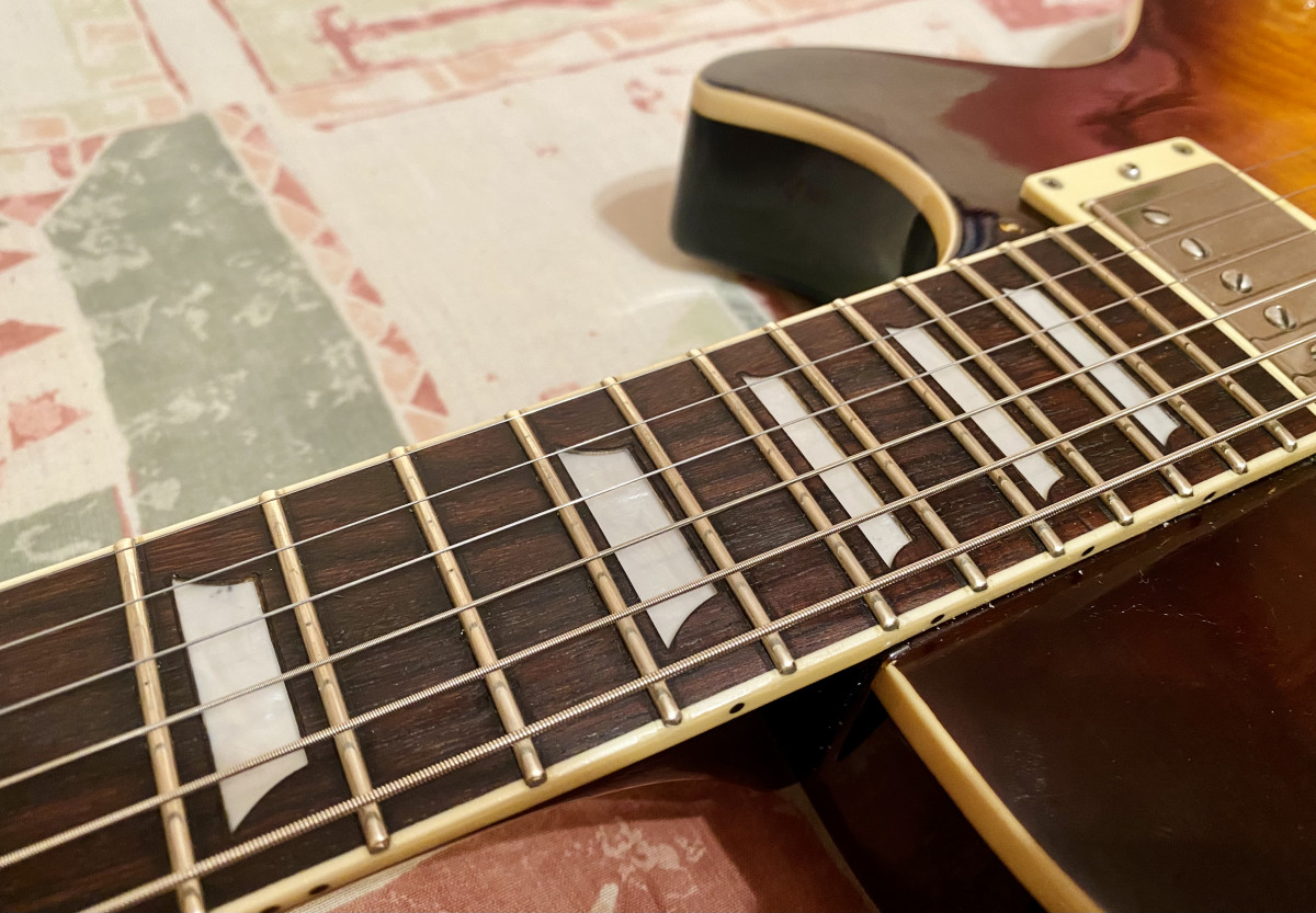 La guitarra ha sido tratada con el mayor de los mimos desde que llegó a mis manos. El mástil es un rosewood precioso, hidratado habitualmente, y he de decir que siempre ha ido bastante prieta con cuerdas Ernie Ball 11-52. Para mí, el calibre perfecto en guitis de 24 3/4.