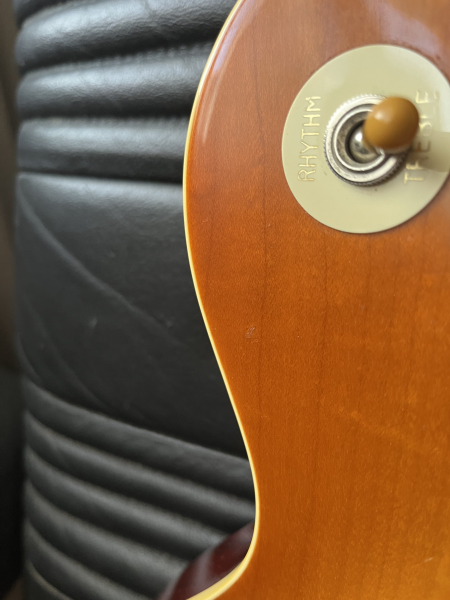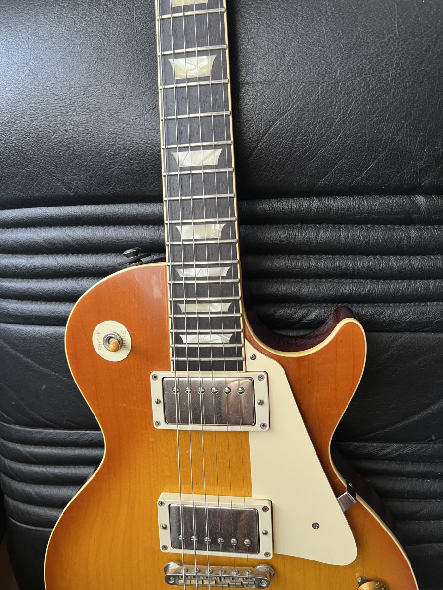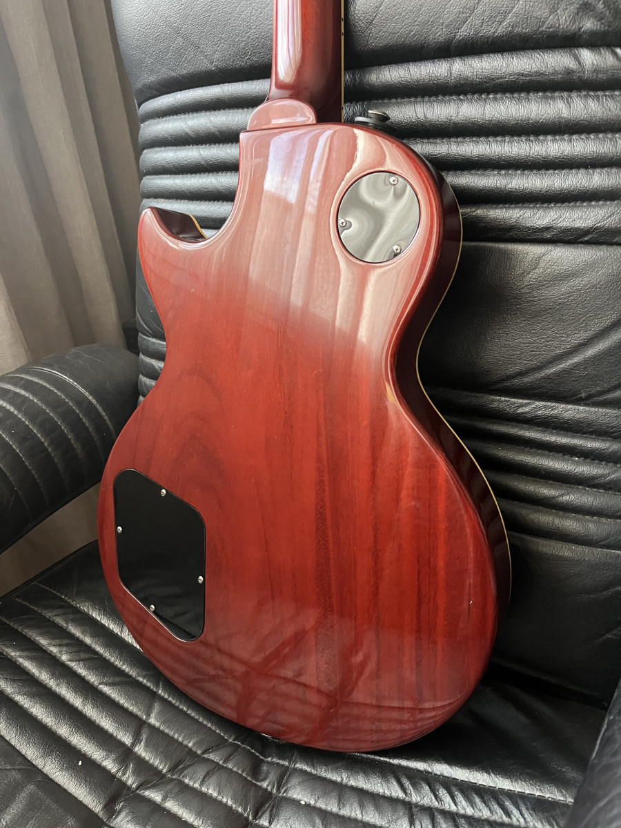 Cuerpo de caoba de una pieza, mástil de caoba de una pieza, diapasón de palorrosa indio y tapa de arce plain pero con un ligero flame.