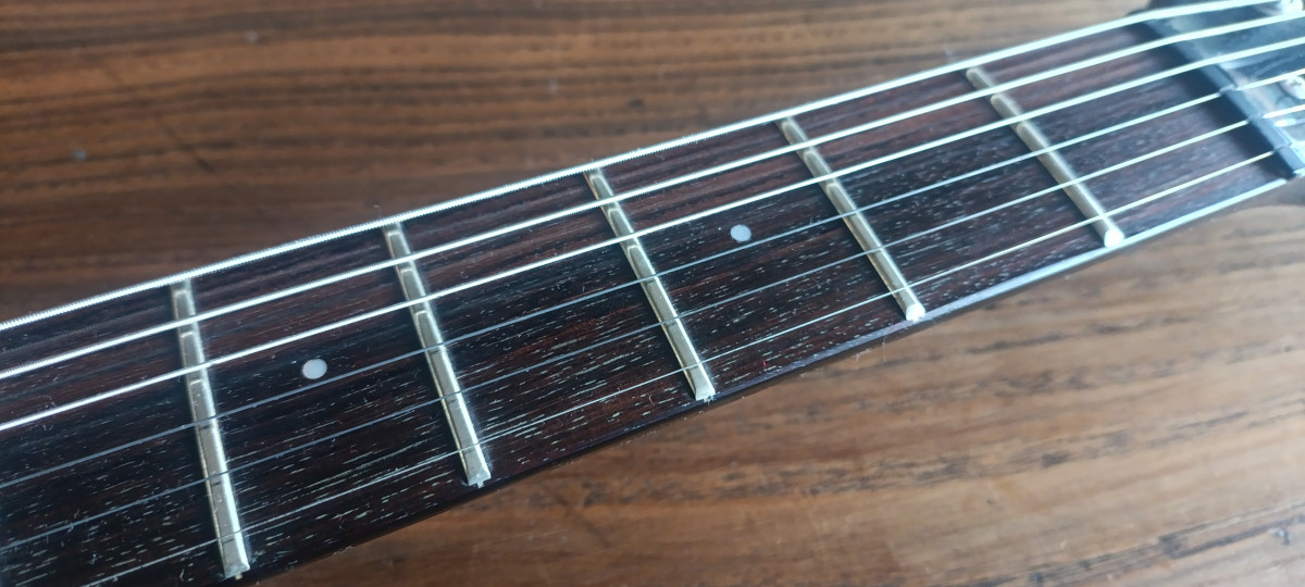 Mástil de fibra de vidrio con diapasón de palorrosa. 22 trastes en perfecto estado y totalmente recto con acción baja (una de las ventajas de la fibra)