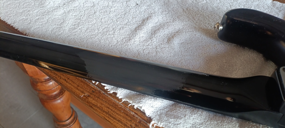 Durante el transporte desde Japón se le saltó un trozo de pintura en la parte de atrás del mástil y lo reparé con spray de nitro, pero quedó un área mate, como se ve en las fotos. Es un defecto únicamente estético, pero entiendo que devalúa la guitarra y por eso pido lo que pido.