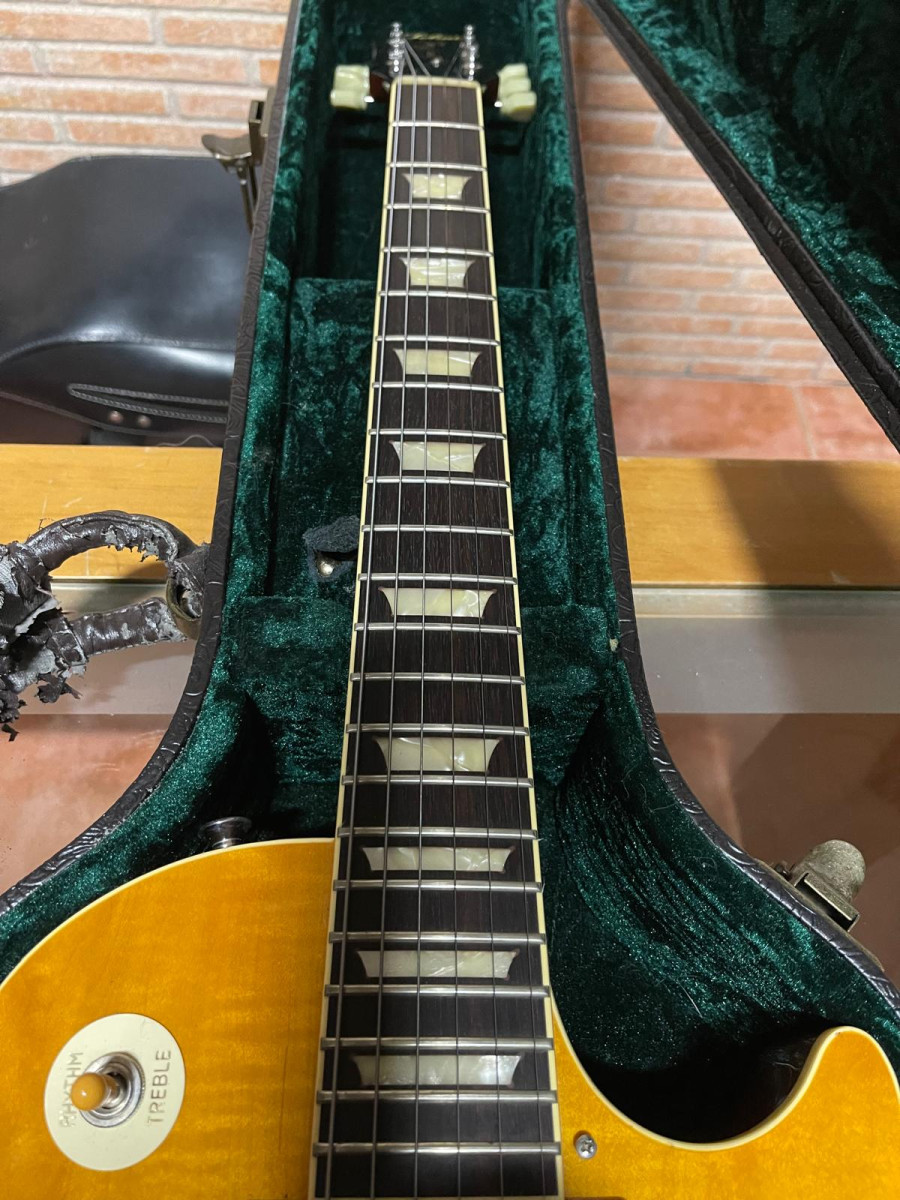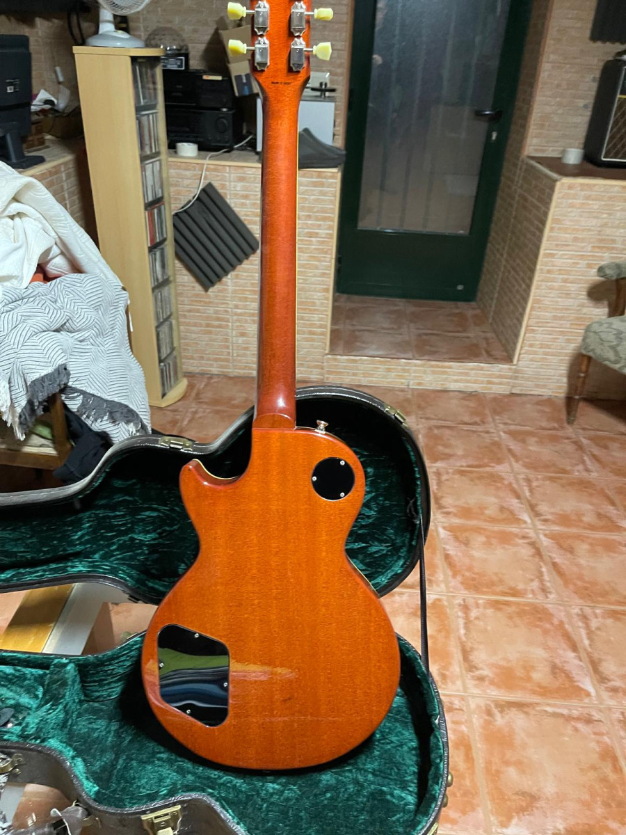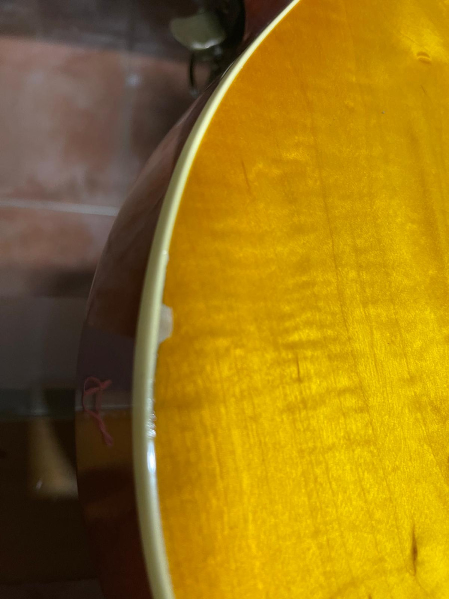 Tiene un pequeño ding que se ve en una de las fotos, por lo demás está prácticamente sin uso, trastes nuevos e impecables al igual que el resto de la guitarra.