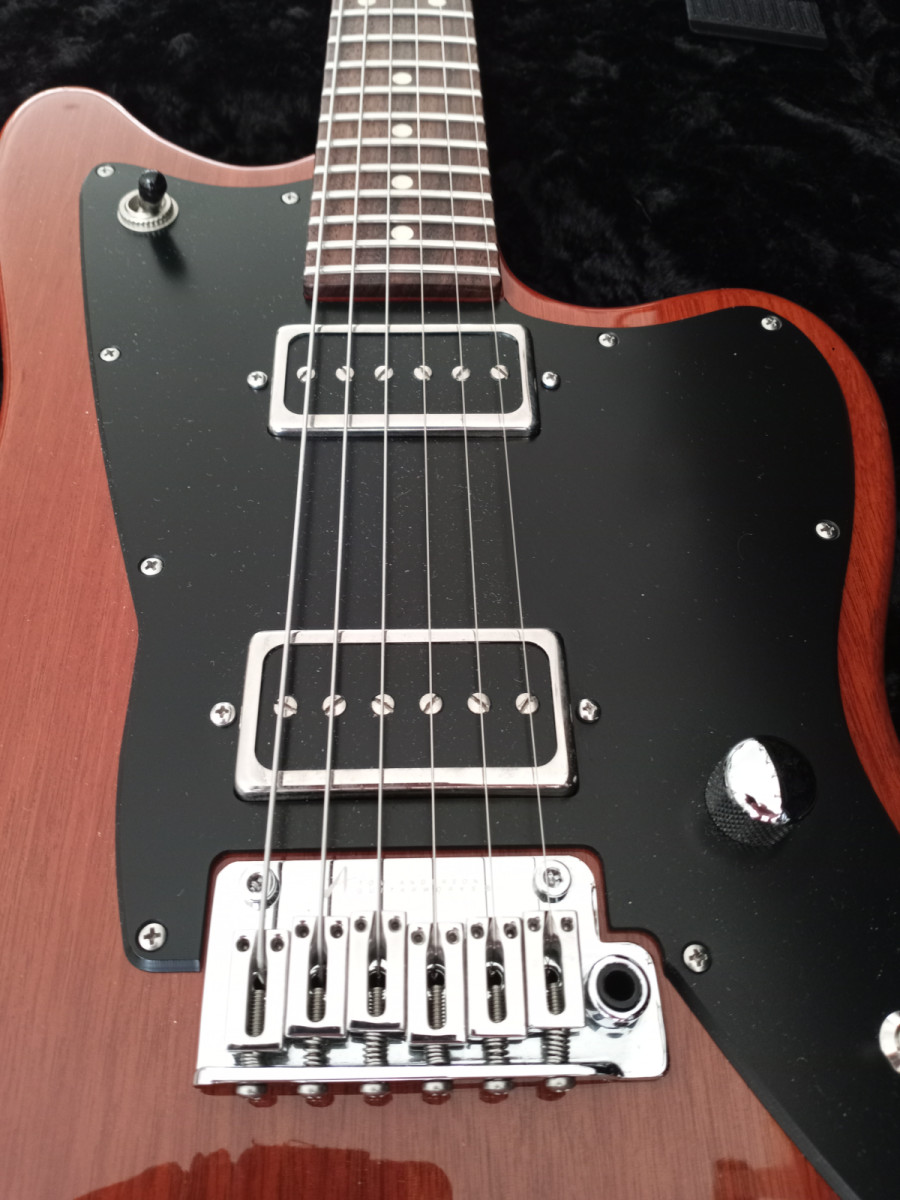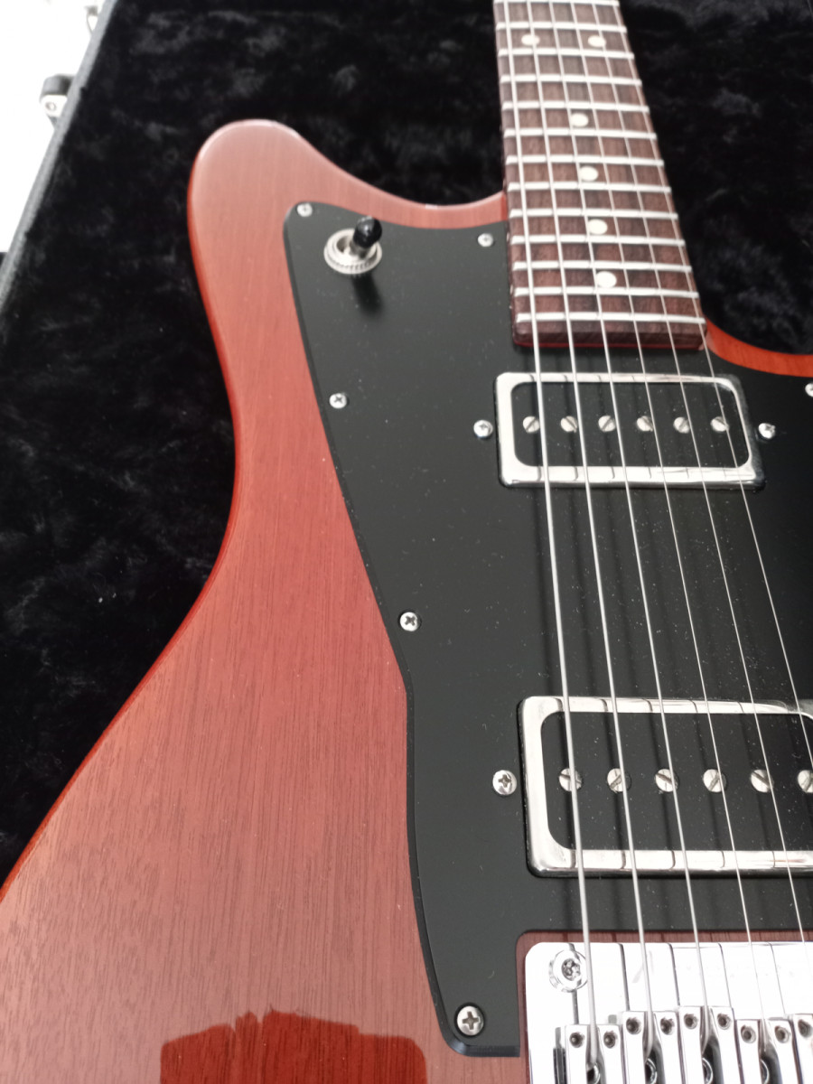 Cuerpo y mastil de caoba, escala corta/gibson,y con pastillas P90 en formato humbucker , asi es mas versatil, se pueden cambiar por humbuckers sin problema.