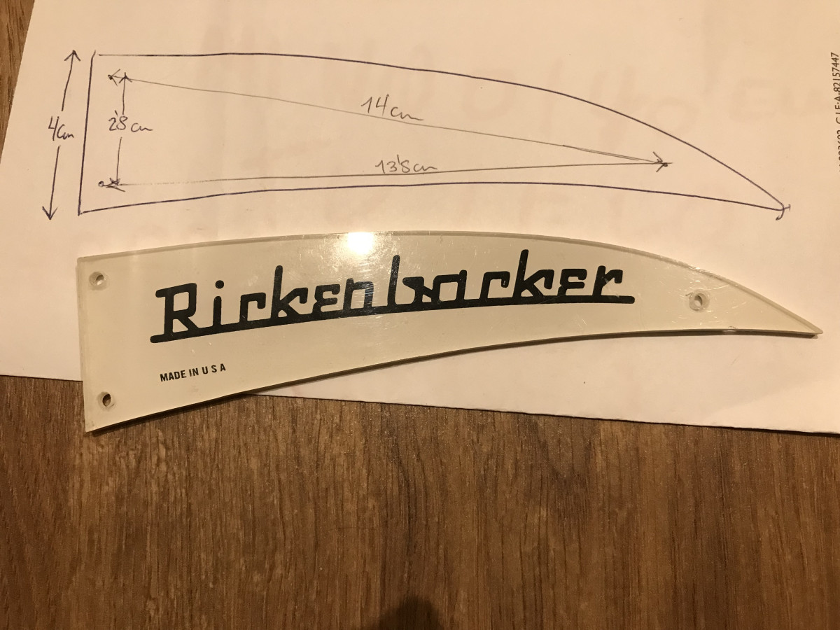 Placa para cubierta de ajuste de alma Rickenbacker, estilo 60s con el logo serigrafiado desde abajo. Ver foto con medidas.