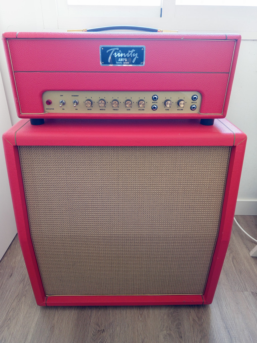 Amplificador hecho a mano en Canadá por Trinity amps, modelo 18W TMB, en color rojo oscuro (oxblood). Viene con pantalla a juego 2x12 con un solo Celestion V30.