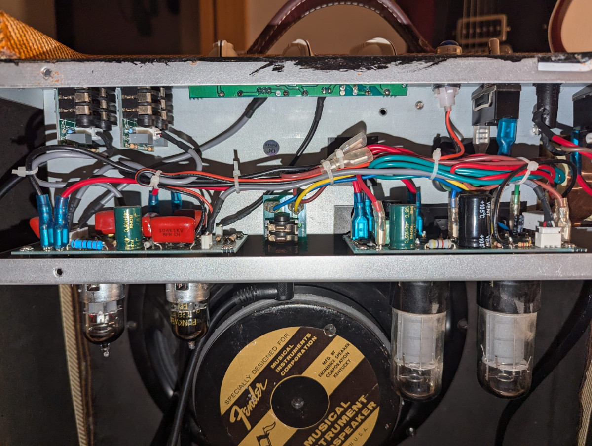 Vendo este clon de Tweed Deluxe 5e3 (modelo mítico de Fender). Poco que comentar de este clásico, puro sonido americano de toda la vida, que se lo digan a Neil Young. Sin mods, con un Fender Special Design. El anterior dueño cambió el asa y le puso algún tipo de pegatina en el lateral, de ahí las marcas. También le hizo algún tipo de "Relic" por eso el aspecto y pintó de negro el faceplate (se puede ver todo en las fotos). El clon está montado en PCB y tiene rectificación a diodos. 600 € envío incluido. Se puede probar en mi estudio en Madrid. NADA DE CAMBIOS.