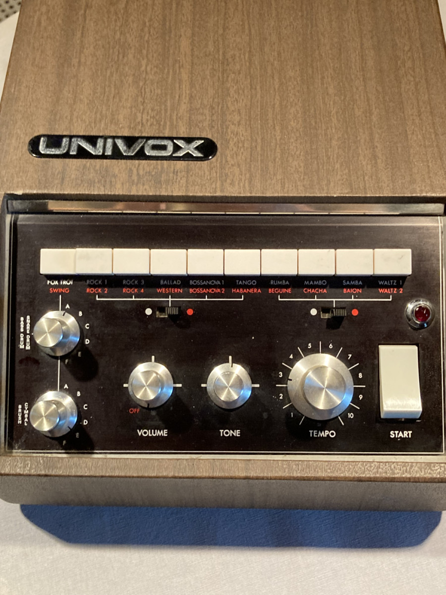 Caja de ritmos analógica Univox SR-55. Vintage de 1972 y bastante rara. Llamada popularmente la Korg Mini-Pops 3. Suena muy bien.