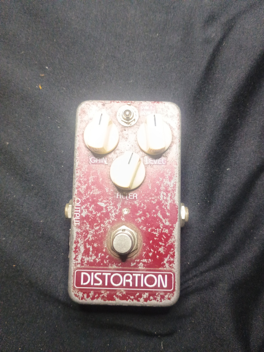 Pedal de distorsión con controles de ganancia, filtro(tono) y volumen. Selector para señal simétrica o asimétrica.