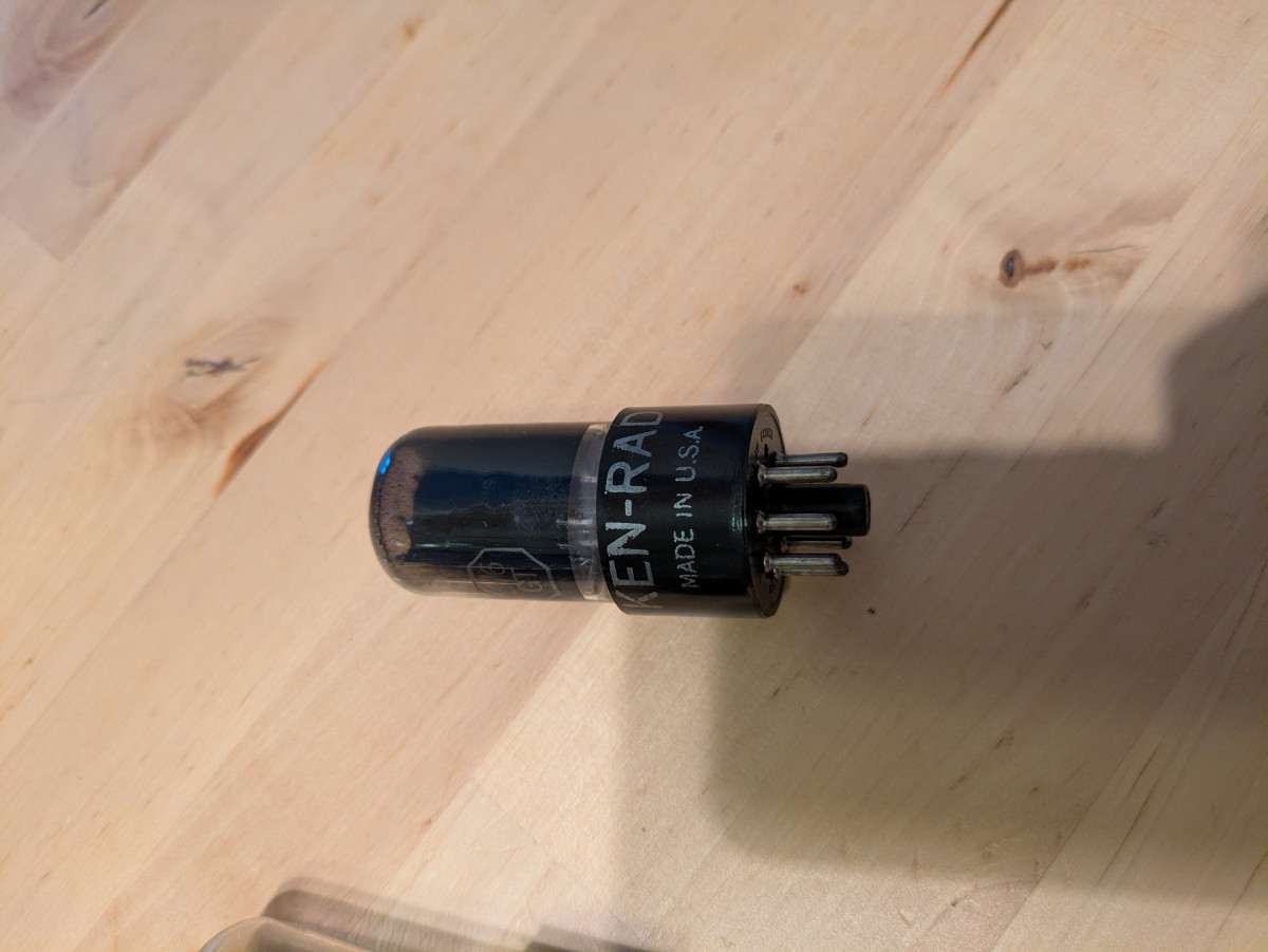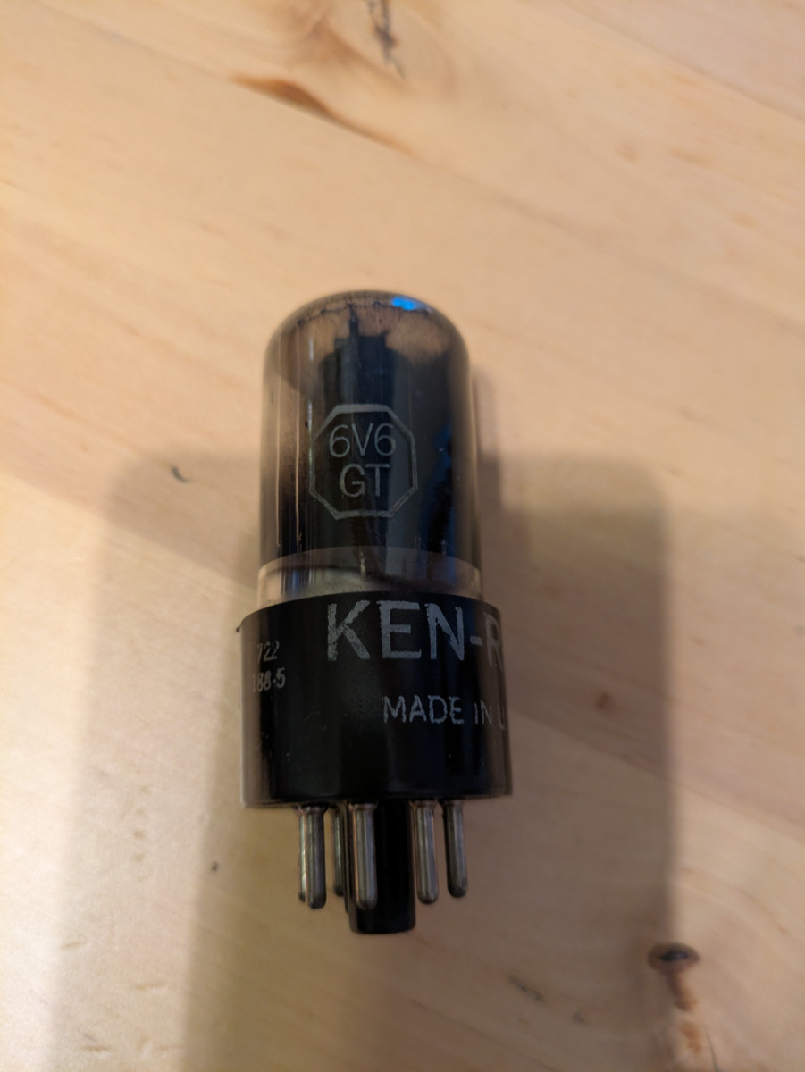 He sacado de una radio vieja esta válvula. No sé en qué estado se encuentra ni tengo manera de comprobarlo, mis amplias usan otro tipo de válvula. Es una 6V6 GT KEN-RAD Made in USA.