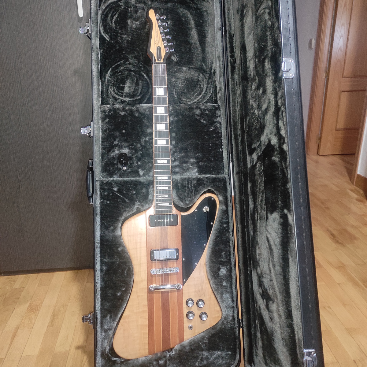 Firebird hecha por Ramón lleonart.mastil de caoba con refuerzos de arce,cuerpo de caoba y tiras de arce intercaladas,tapa de arce del pantano,pastillas p90 y minihumbucker,clavijeros grover.perfecto estado,no cabecea nada y poco peso.funda rígida.cambio por stratocaster o amplificador a válvulas de pocos wats