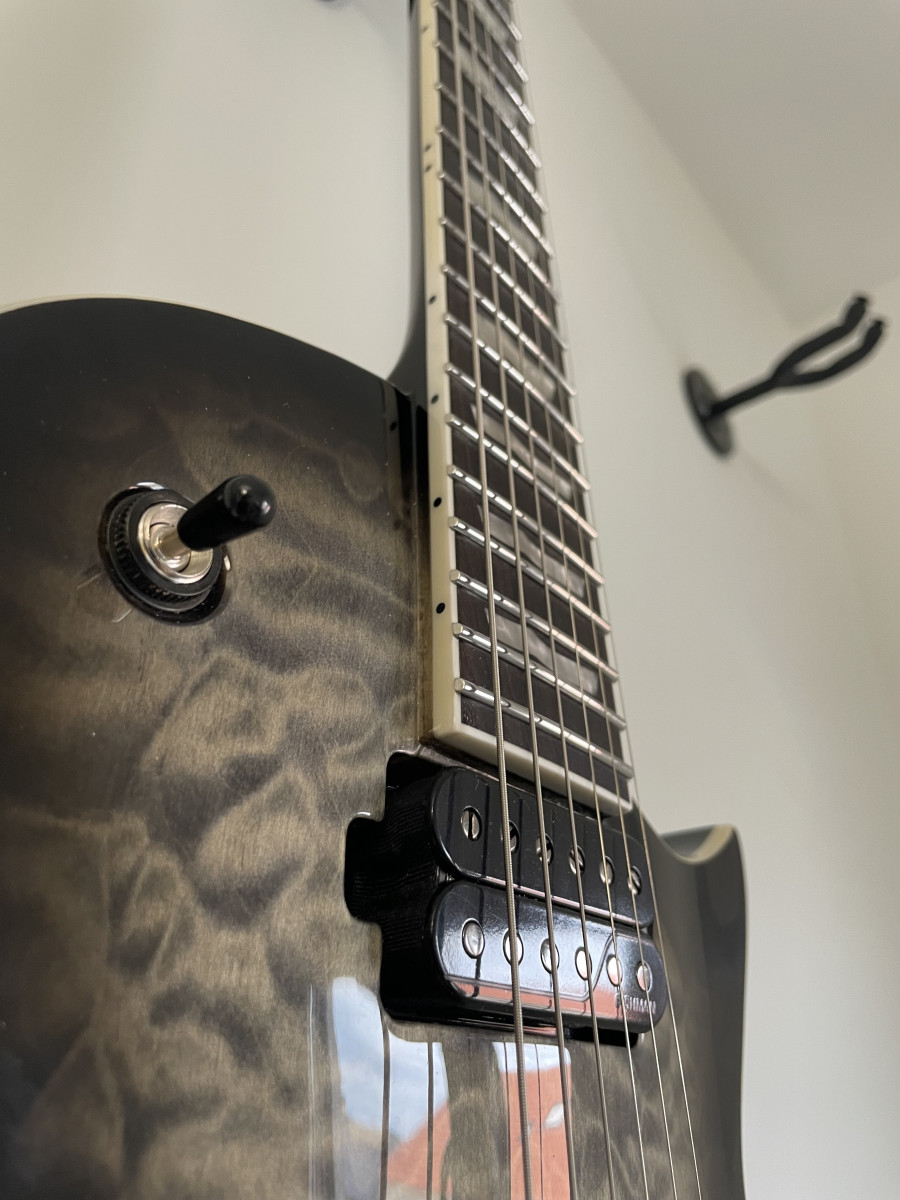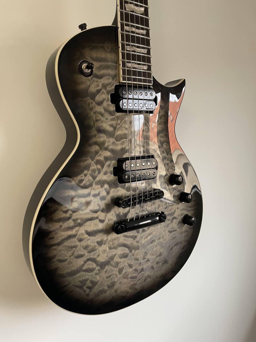 Vendo o cambio esta magnífica LTD EC-1000 CB QM “Eclipse” una guitarra muy apreciada con acabado especial Charcoal Burst y tapa de arce acolchado. El mástil es muy rápido y cómodo tipo set-thru con perfil “Thin U”. Escala 24,75". Cuerpo de caoba con una preciosa tapa de arce quiltes maple. Diapasón de ébano Macassar con 22 trastes de acero extra jumbo. Puente Tonepros Locking TOM & Tailpiece. Clavijero LTD Locking. Pastillas humbucker activas Fishman Fluence Open Core Classic con push pull para hacer single.
