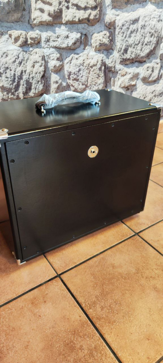 La pantalla es de fabricación propia en abedul de 18mm de 52cmm de largo, 42cm de alto y 28cm de fondo y tiene tapa cerrada.