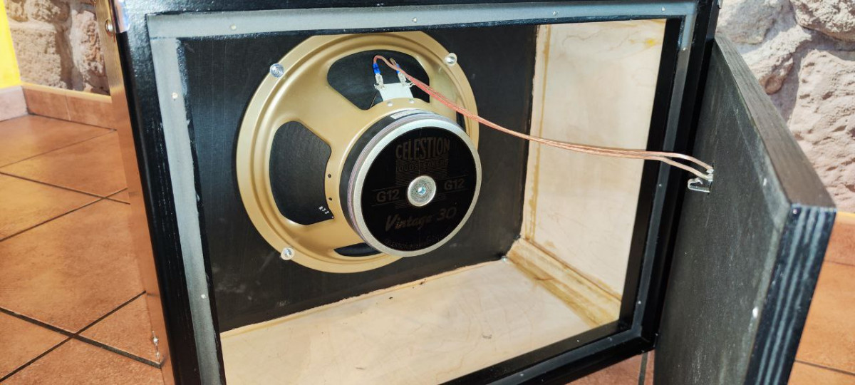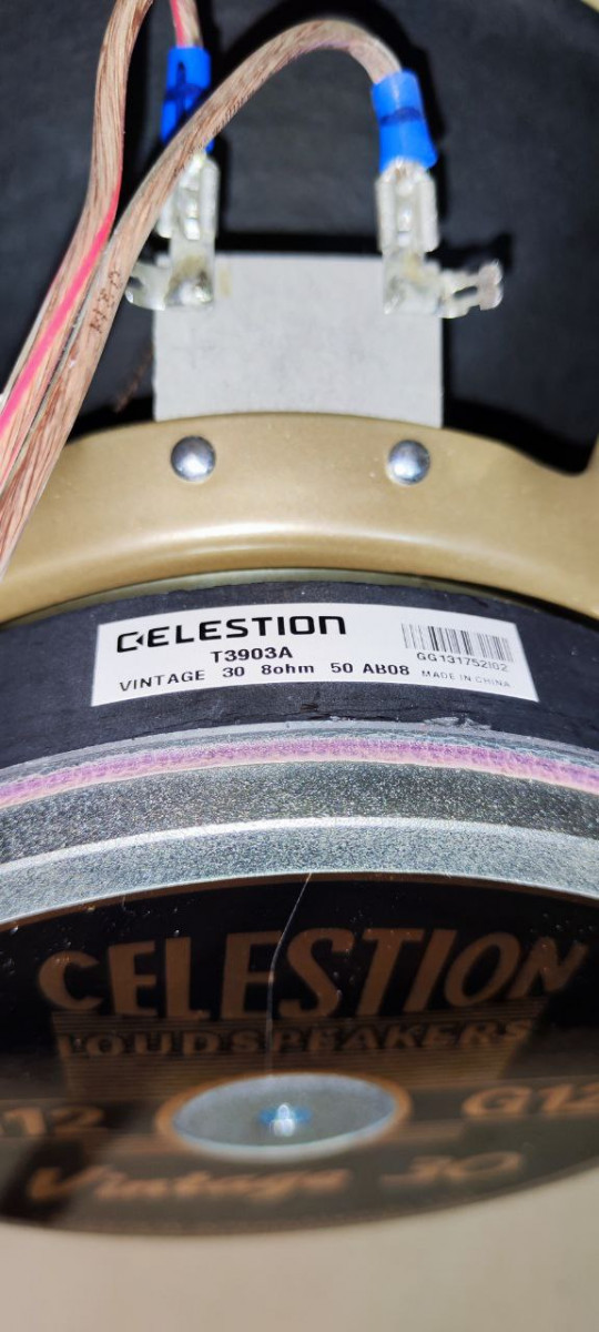 Lleva un Celestion Vintage V30 muy poco usado, funciona perfectamente.