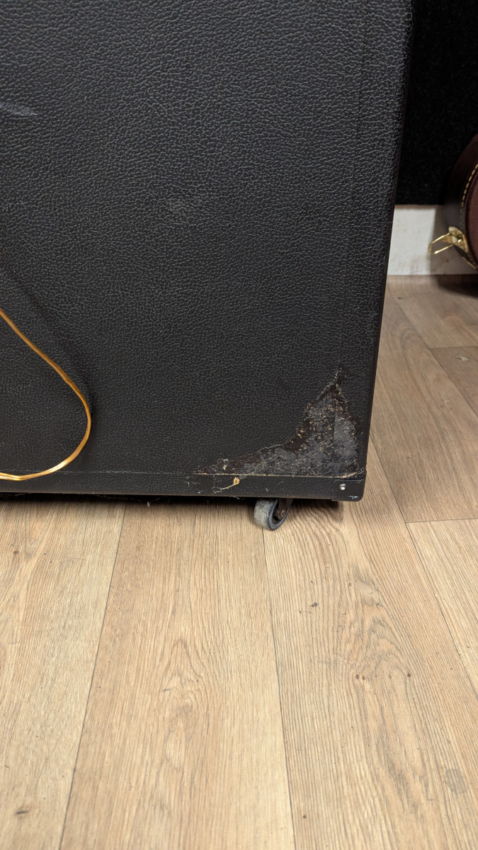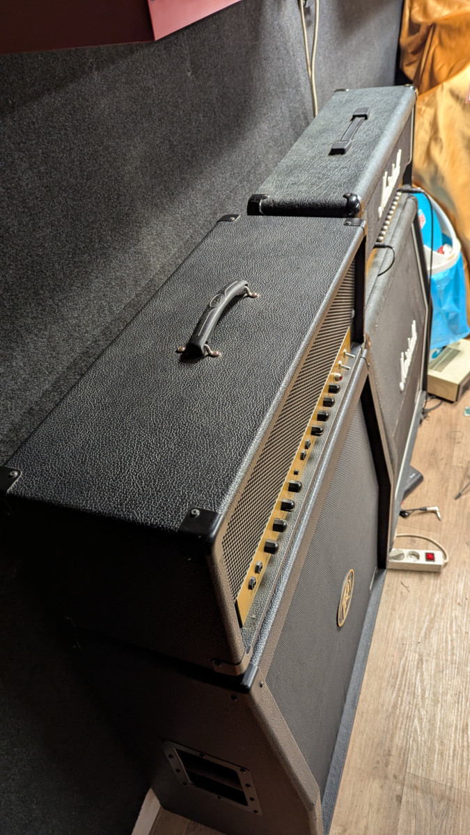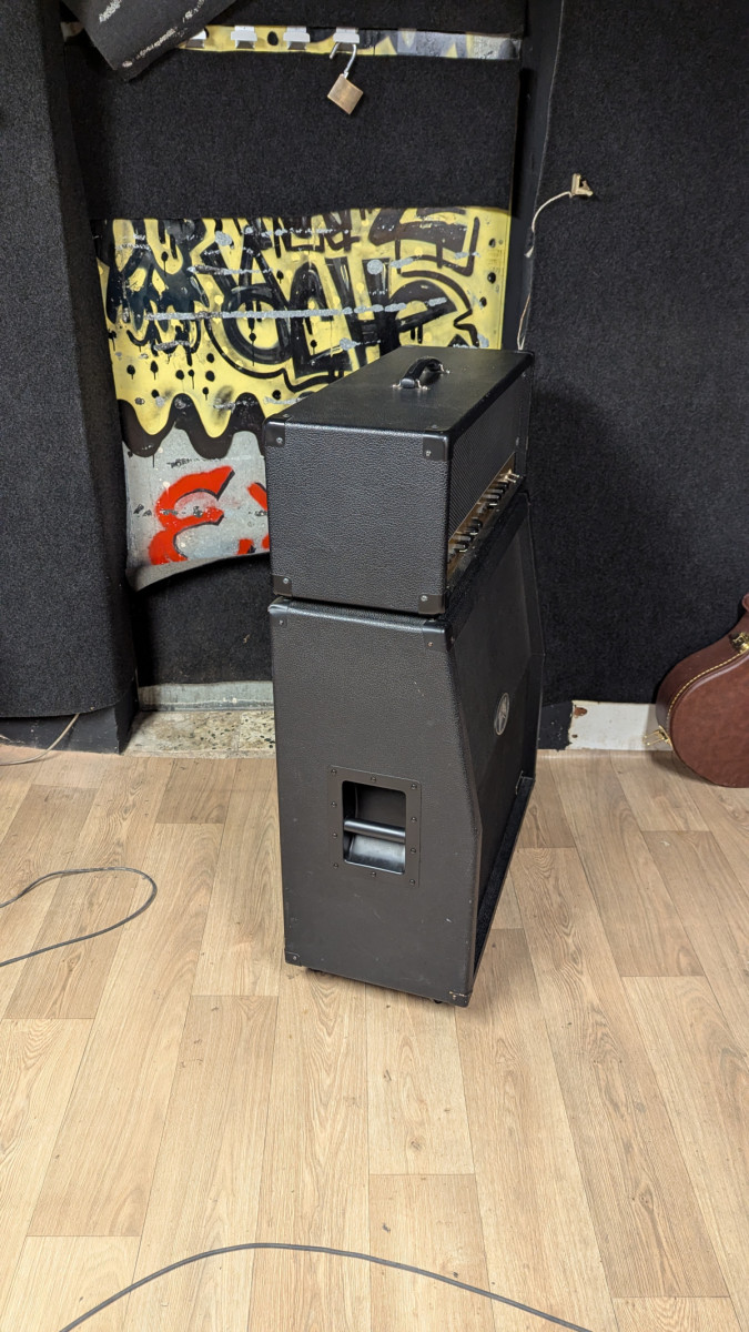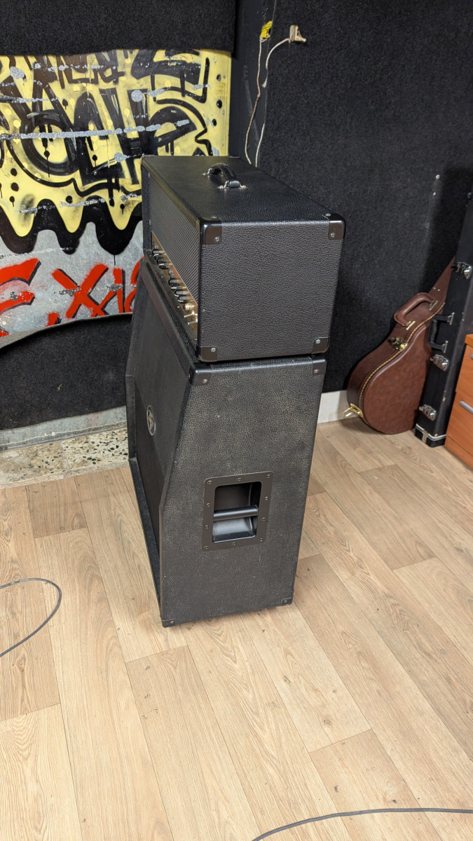 Hola! pongo a la venta este amplificador de 100W completamente a valvulas + pantalla 4x12 en perfecto estado y funcionando al perfectamente, es un ampli monocanal, con opción de boost por boton o poniendo un footswitch, también tiene loop de efectos en el frontal, master volume y volumen de previo, para sacar tando sonido limpio como distorsionado a cualquier volumen, esta montado con el mueble al reves, simplemente porque me gusta así, se puede recolocar en un momento, tiene hecha una modificación para que no con el previo bajo aguante un poco mas el limpio, lo unico que no dispongo de la madera blanca que va en el frontal, tiene rejilla en los 2 lados, de esta manera ademas no acumula tantro calor dentro del mueble. El unico desperfecto estetico se encuentra en la parte trasera de la pantalla, que se deterioró el tolex en una esquina.